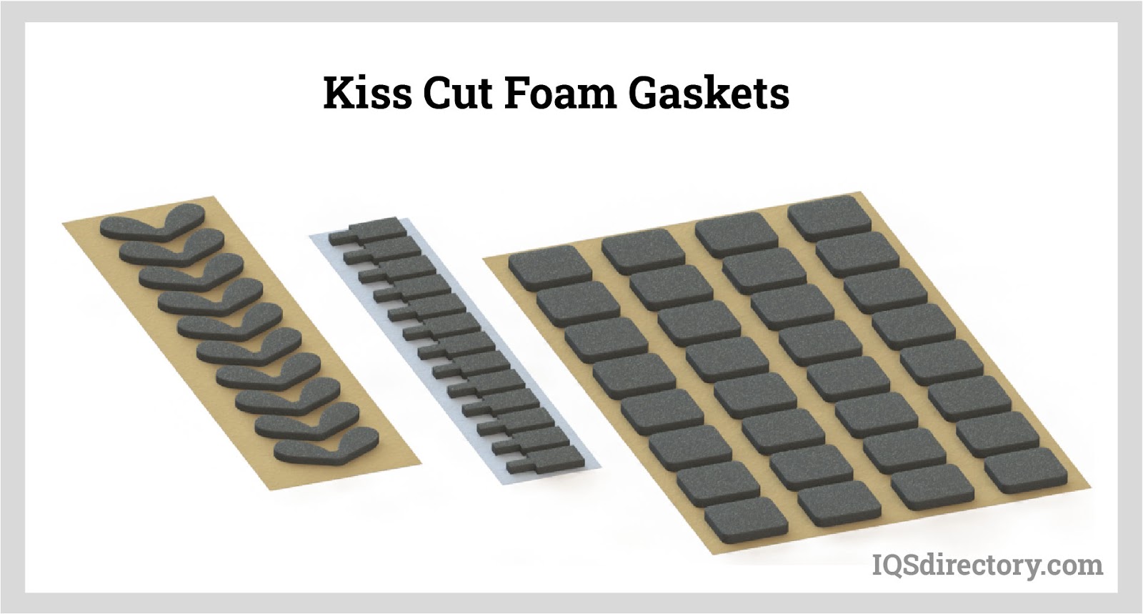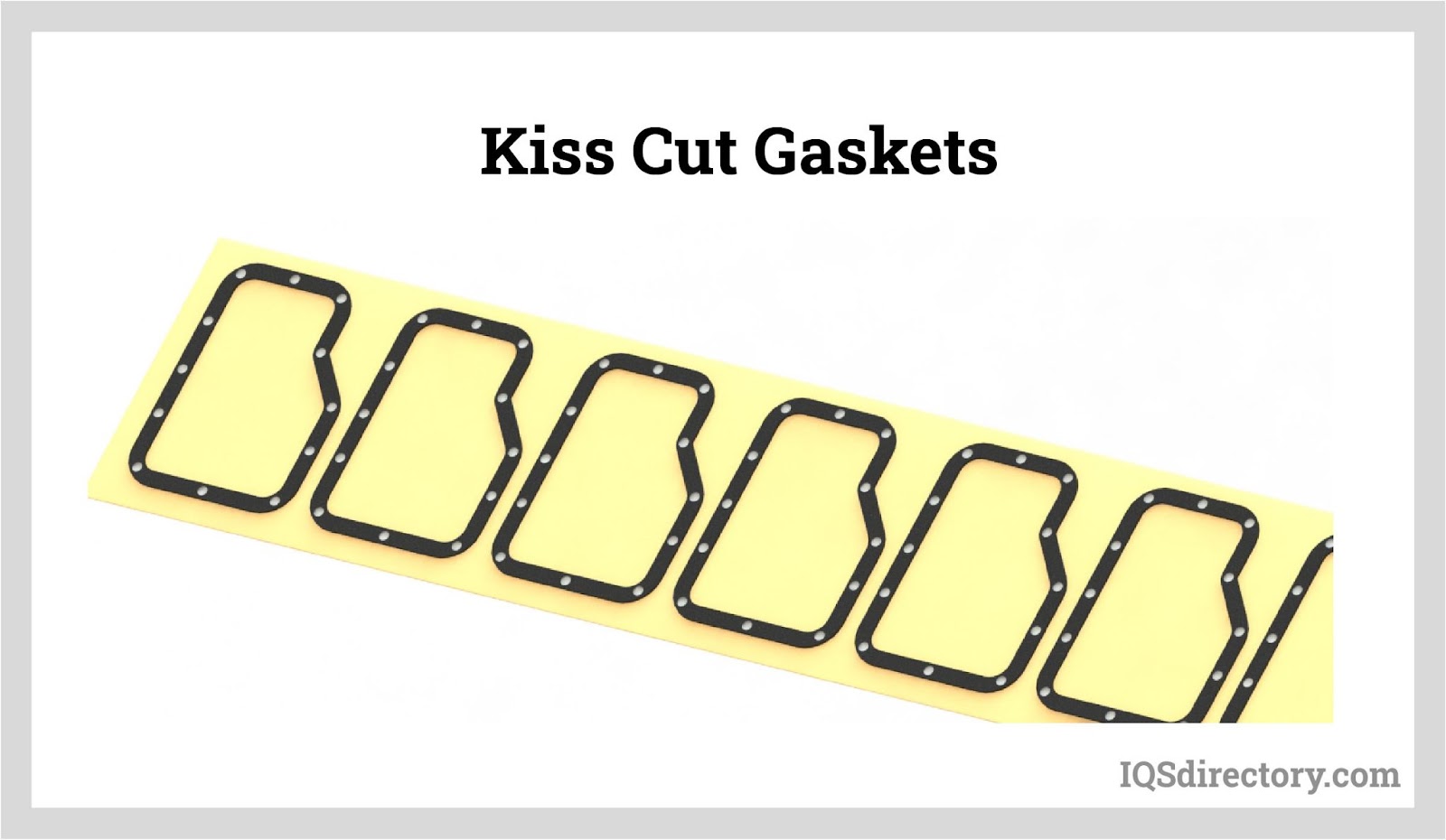 Kiss cut gaskets are manufactured from a range of materials such as rubber, vinyl, nitrile, and flexible graphite. The material is adhered to a pressure-sensitive adhesive backing, and the gasket shape is then cut out. Gaskets are supplied in rolls for convenient removal and application by assembly operators.