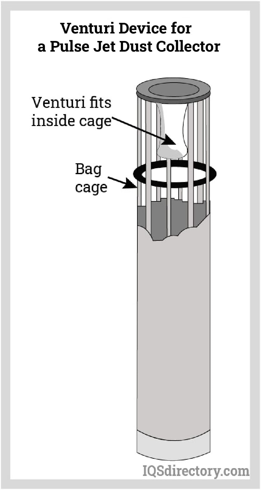 The air bursts are delivered through a Venturi valve, a cone-shaped device positioned at the top of the tubular filters. The Venturi creates a negative pressure at its top, which helps pull additional air into the filter walls during the pulsing process.