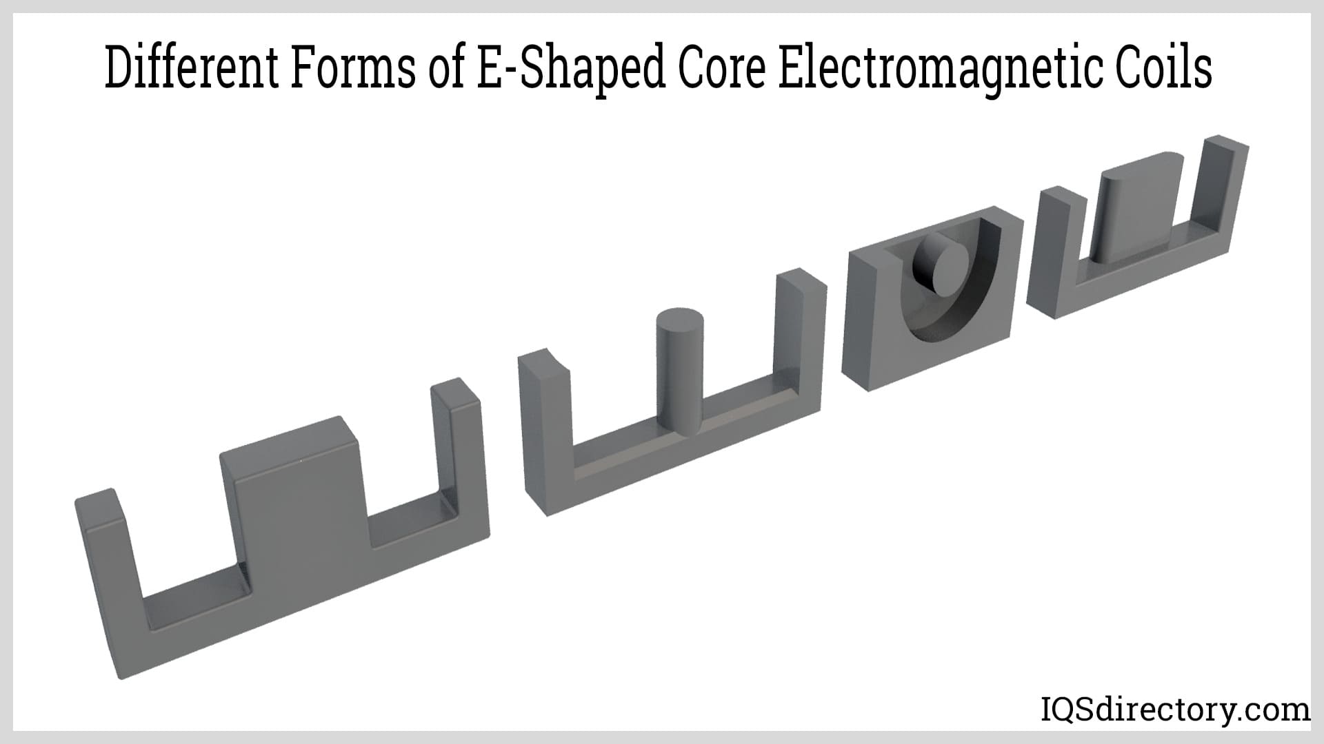 The term "E-shaped" describes a category of electromagnetic coils designed in the shape of the letter E. The central leg of this E can come in various forms such as cylindrical, cubic, rectangular, or elongated oval. This central leg is typically the primary area for winding the coil due to its larger surface compared to the other two legs.