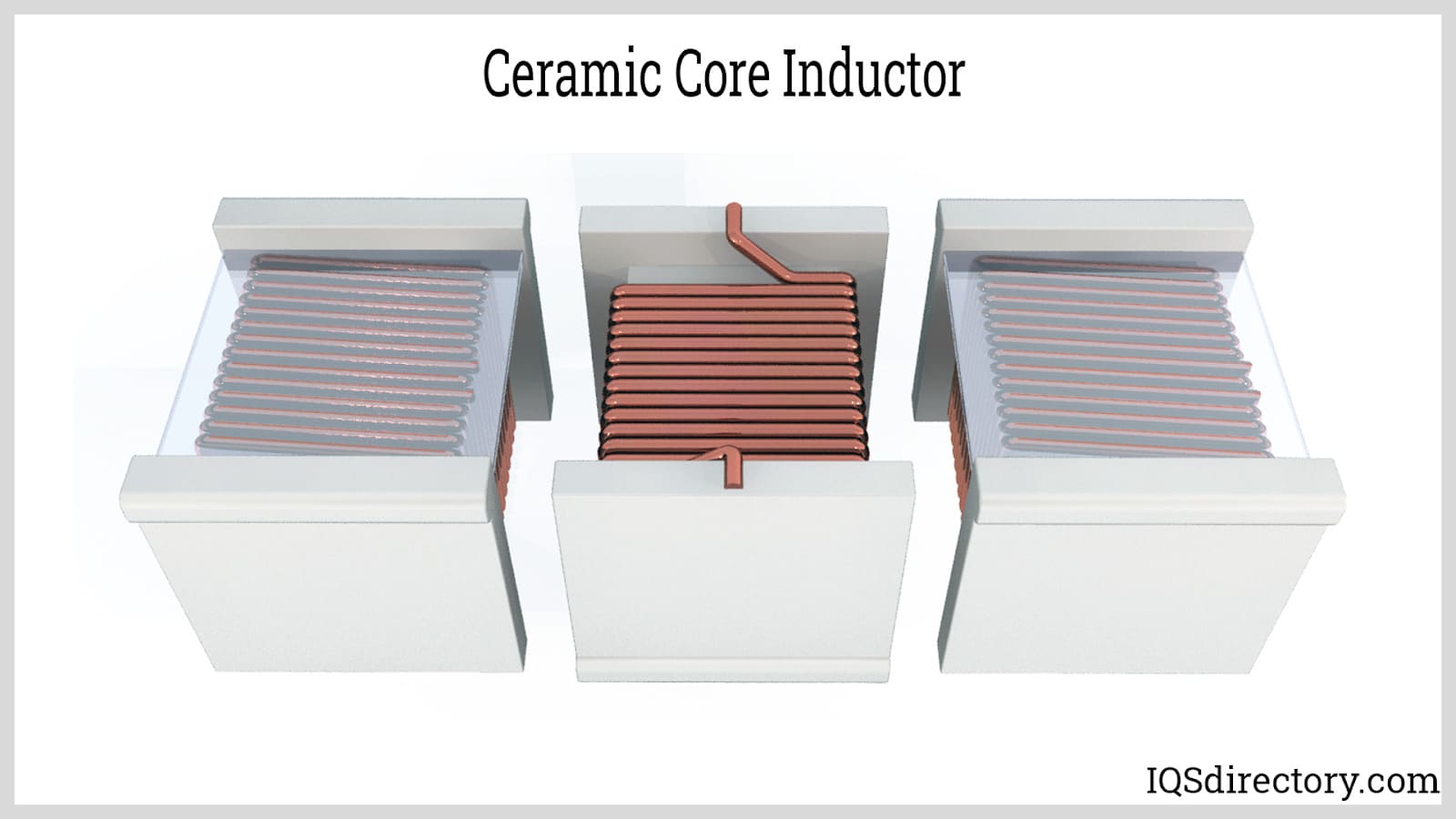 Because it is a non-magnetic material, ceramic has very low magnetic permeability, resulting in low achievable inductance values. Core losses are minimized, and ceramic core inductors exhibit excellent stability and high Q factor, making them suitable for demanding RF front-end circuits, IF transformers, and low distortion filter networks. However, high inductance values are not practical due to the inherent material limitations.