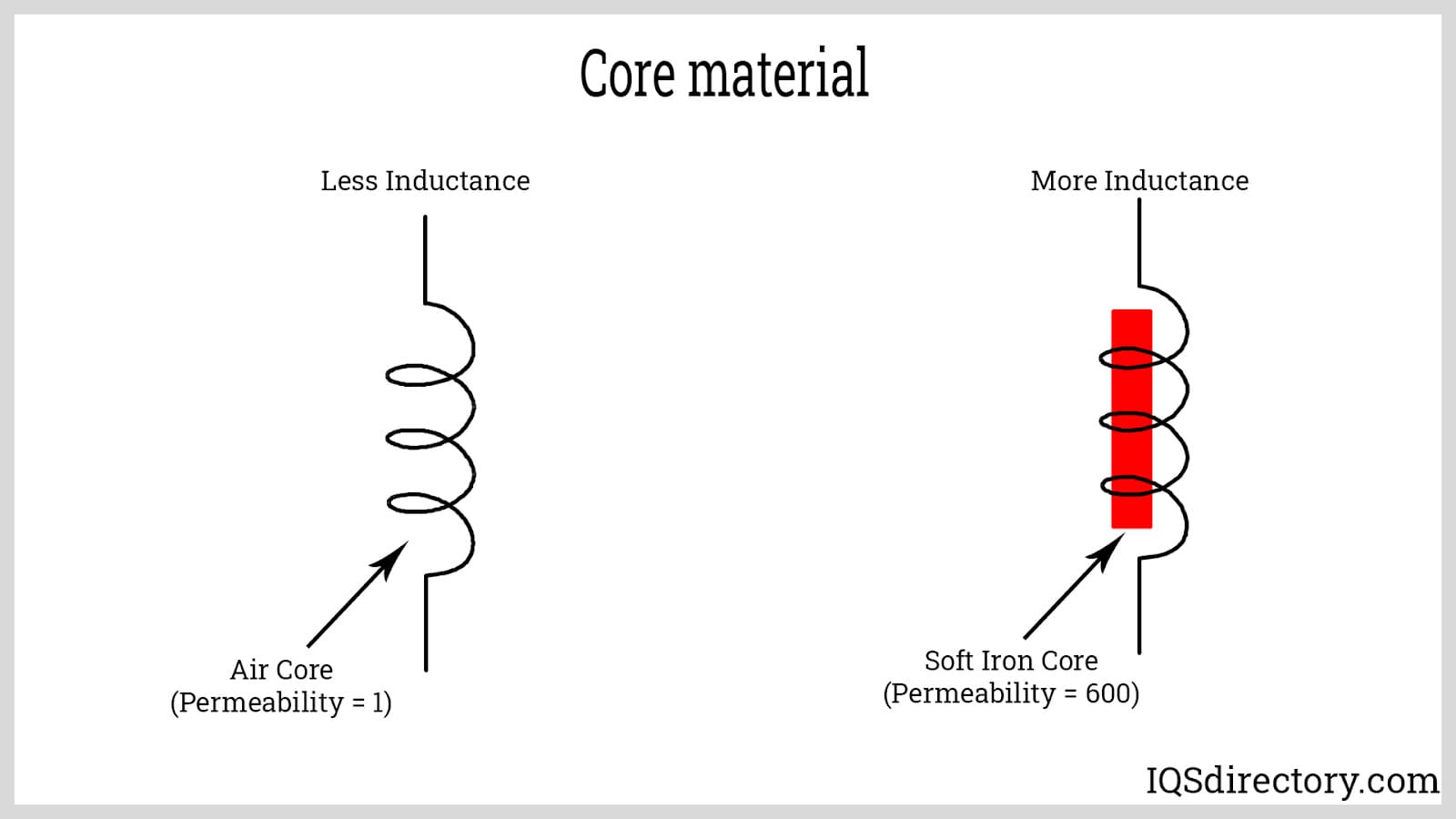 Assuming all other factors are equal, a core material with higher magnetic permeability will result in greater inductance. Conversely, a core with lower permeability will produce less inductance. This is because materials with higher magnetic permeability generate a stronger magnetic field flux for a given magnitude of field force (amp-turns).