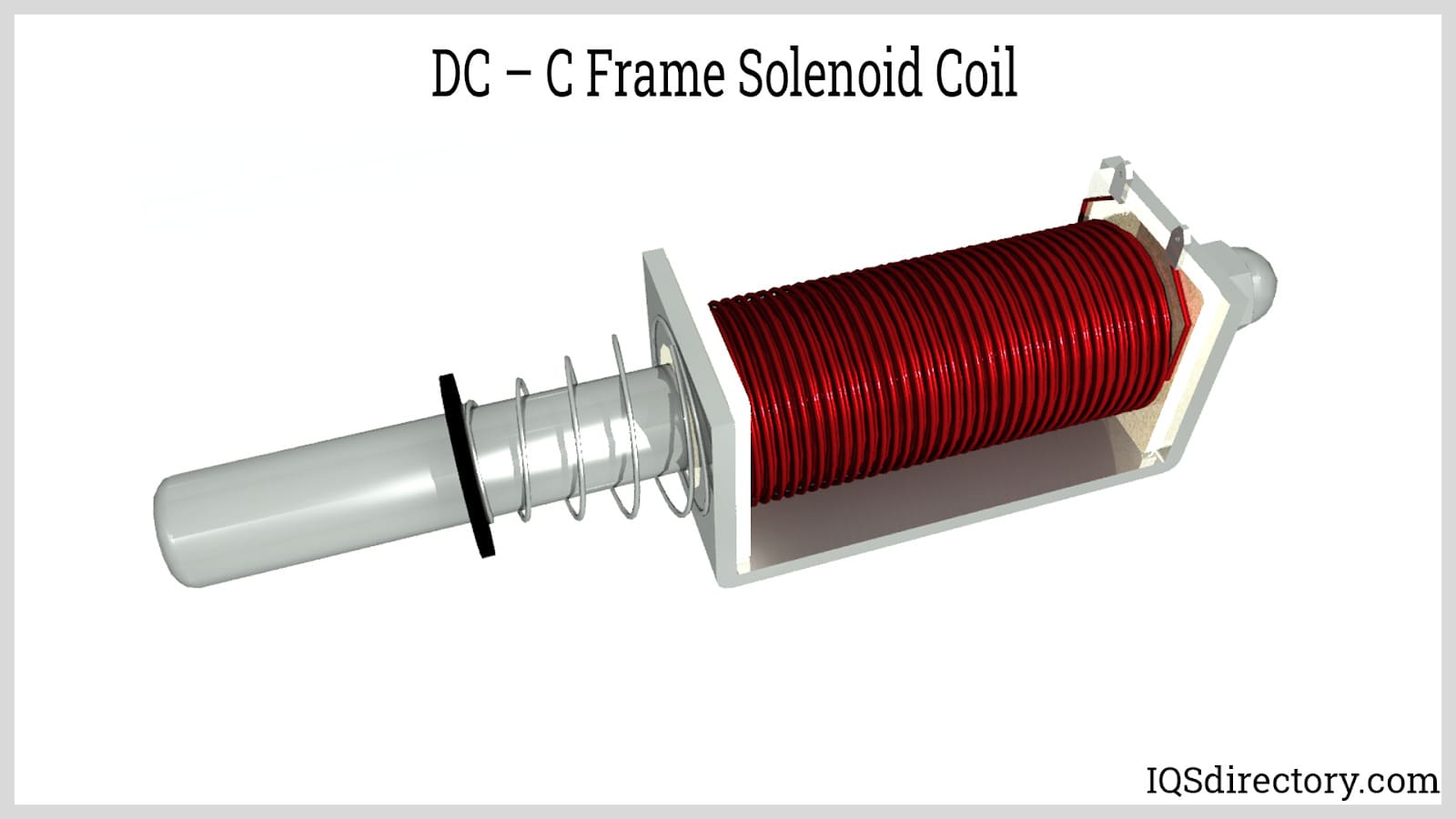 The C frame of a DC solenoid coil features an open frame design to enable linear motion. It represents one of the simplest and most cost-effective solenoid configurations while delivering high performance. Available in both push and pull configurations, it is commonly used in straightforward applications such as circuit breakers, scanners, coin counters, and point-of-sale devices.