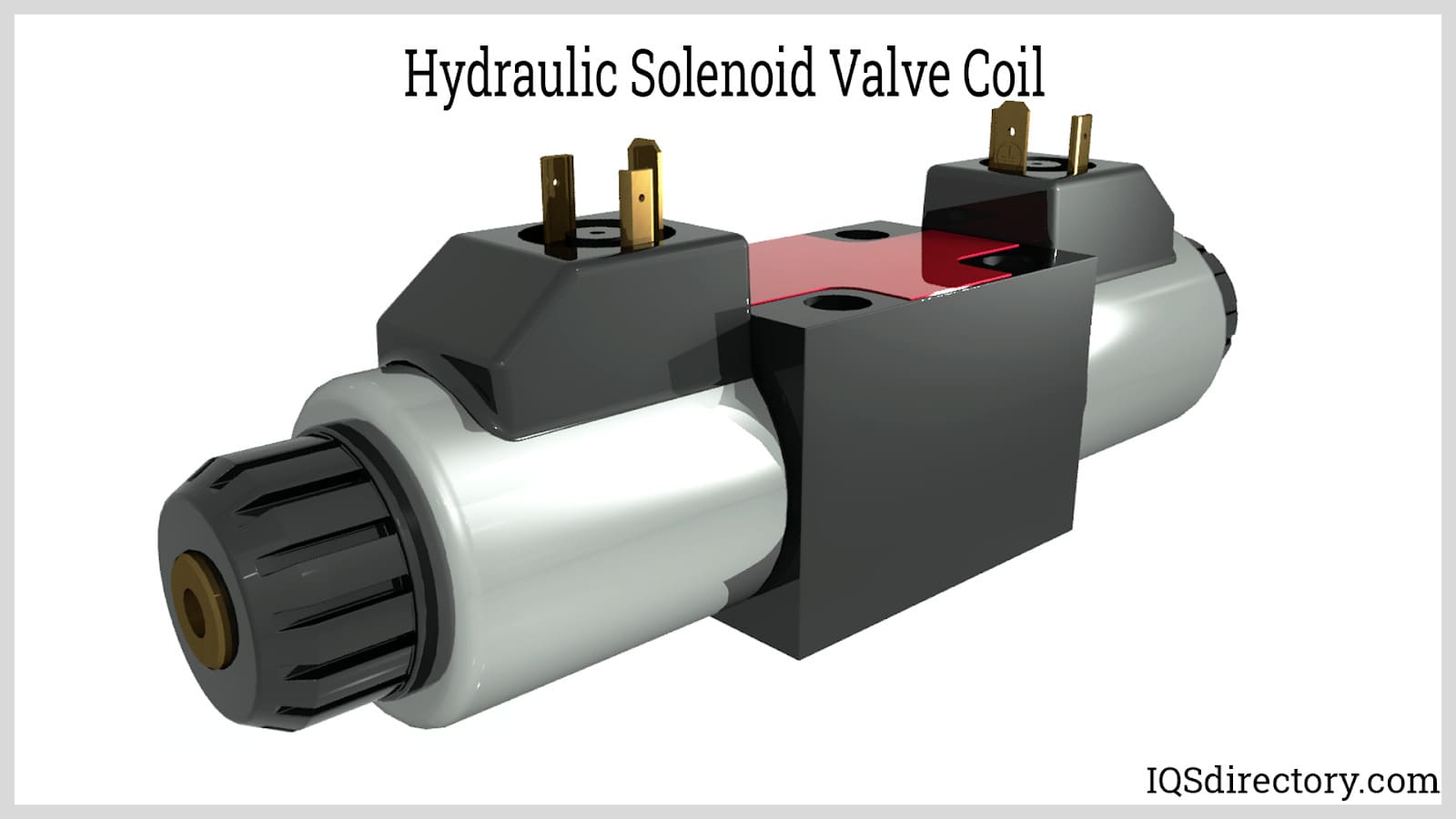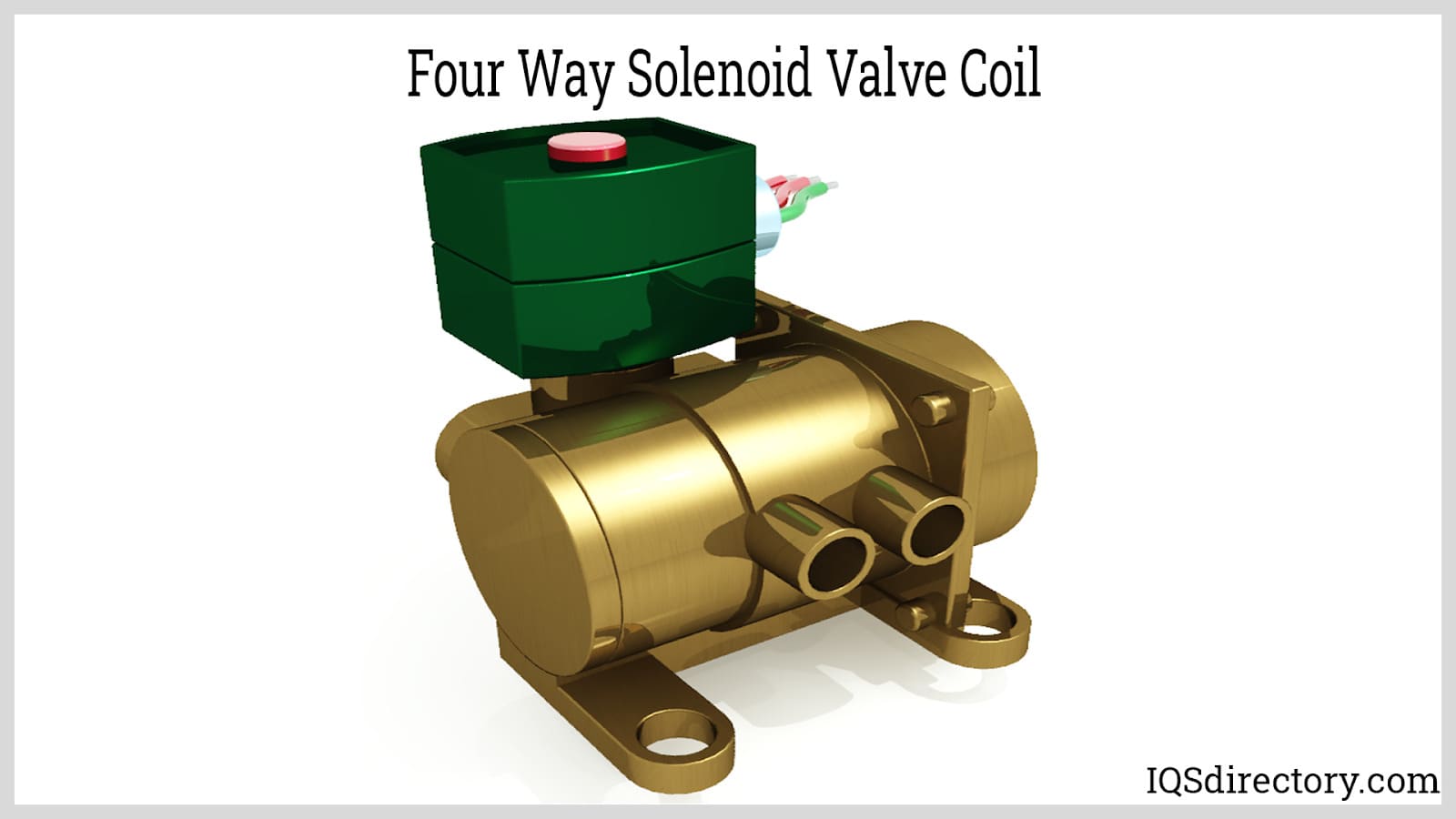 A four-way solenoid valve coil features an additional port, with two ports serving as inlets and the other two as outlets. This design is used to operate double-acting solenoid valve actuators.