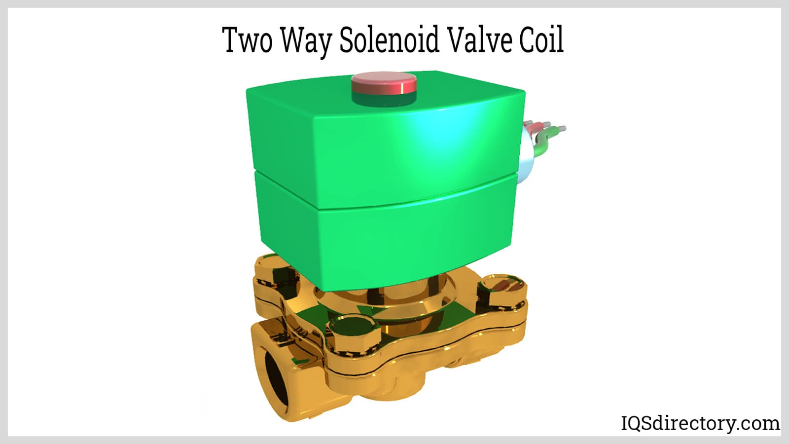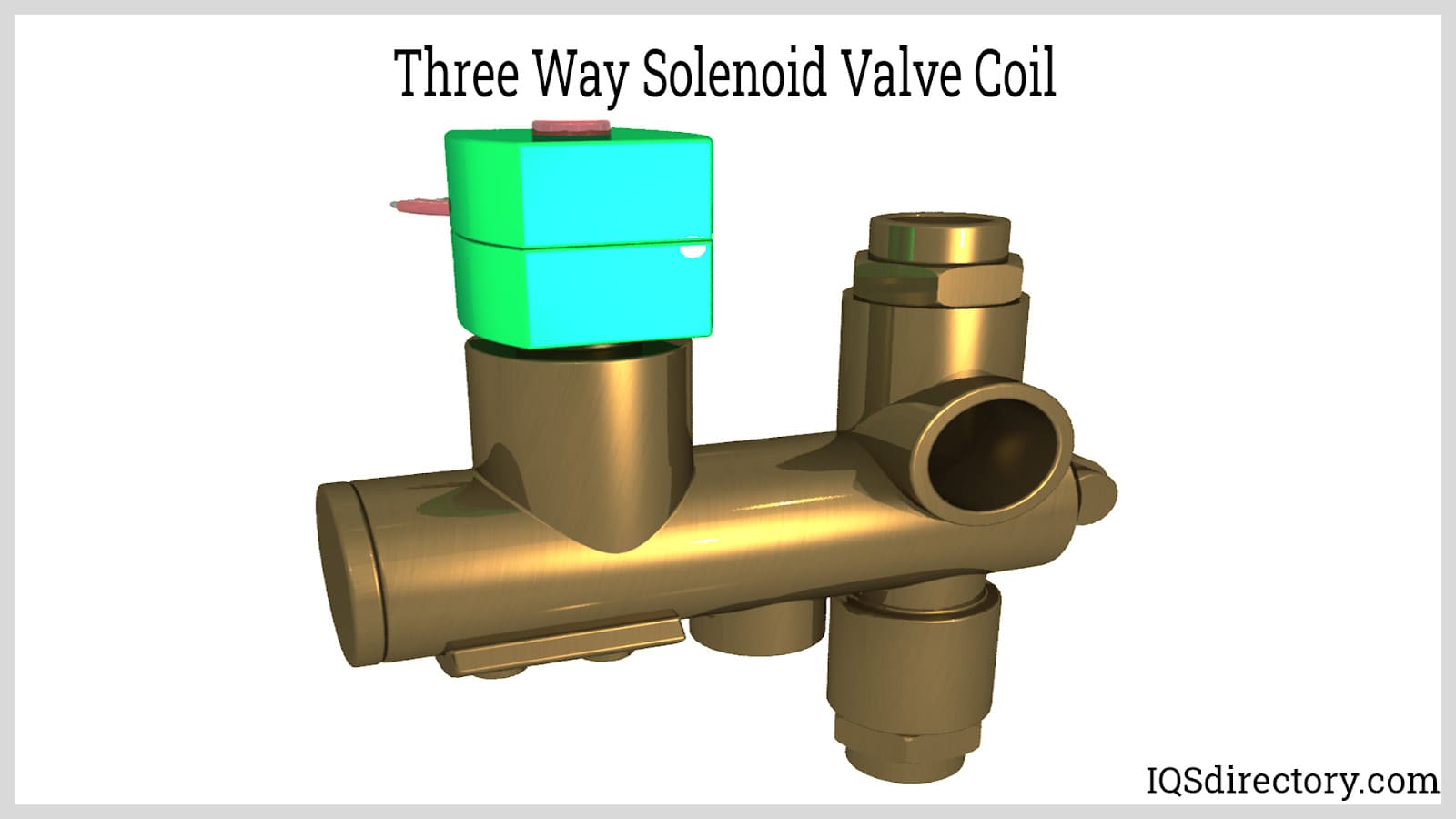 A three-way solenoid coil includes three ports and two openings that alternate based on the coil's requirements. Two of the ports serve as inlets, while the third port acts as an outlet. This configuration allows for the control of two different fluids.