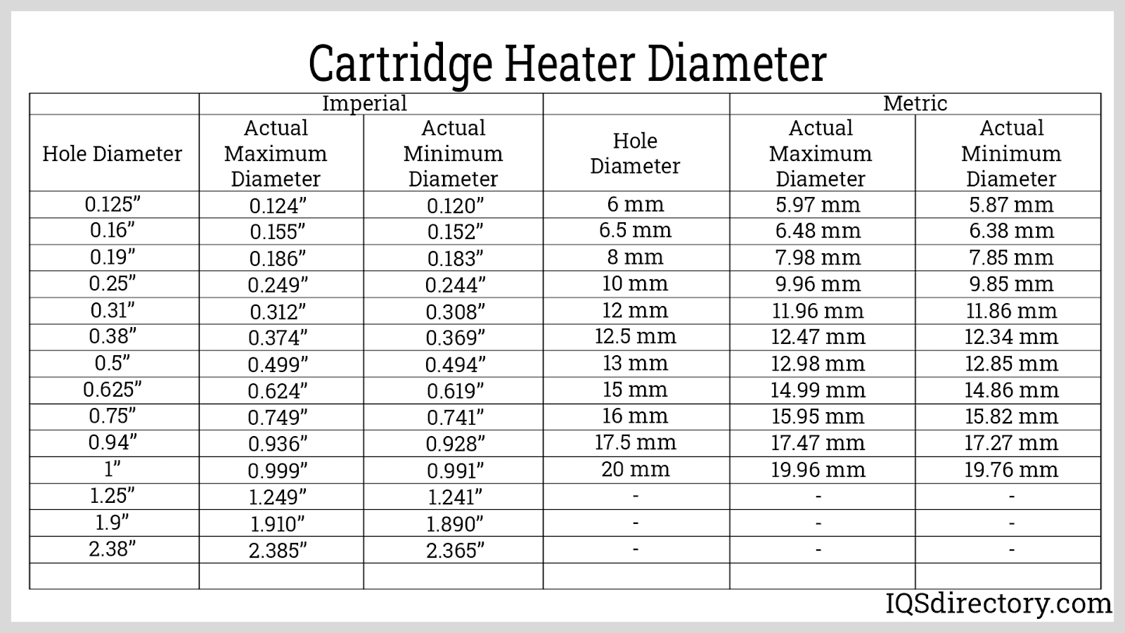 Matching cartridge heater diameter to the correct hole size is essential for optimal heat transfer and efficient, safe operation. As a general rule, the heater’s outer diameter should measure 0.004 inches less than the hole's diameter for a snug press fit that allows for thermal expansion during operation. This careful tolerancing prevents excessive air gaps—which can lead to overheating and uneven temperature distribution—and minimizes the risk of bore seizure or heater damage. Refer to the chart below for standard imperial and metric diameter specifications and tolerances to help you select the right heater for your application.