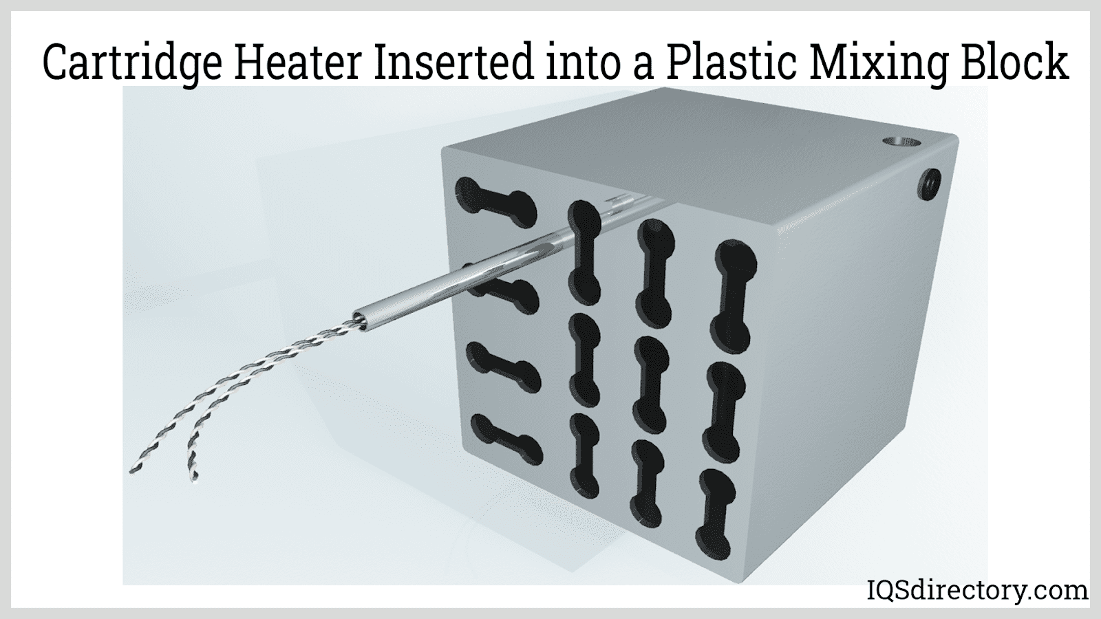 The image below illustrates a plastic mixing block with a dedicated insertion port designed for a ten-inch cartridge heater with a five-inch heated section—highlighting how strategic placement impacts process heating efficiency.