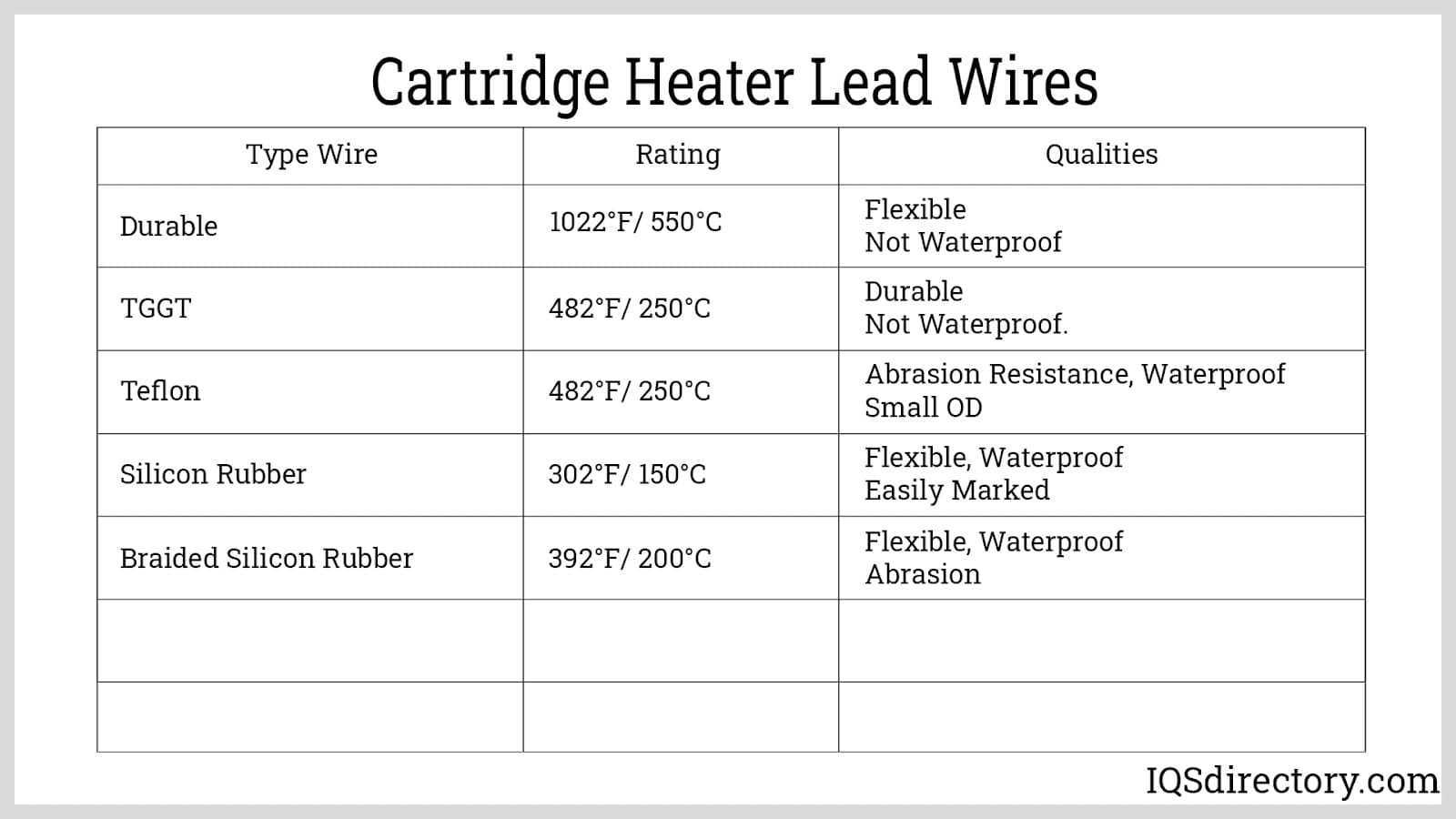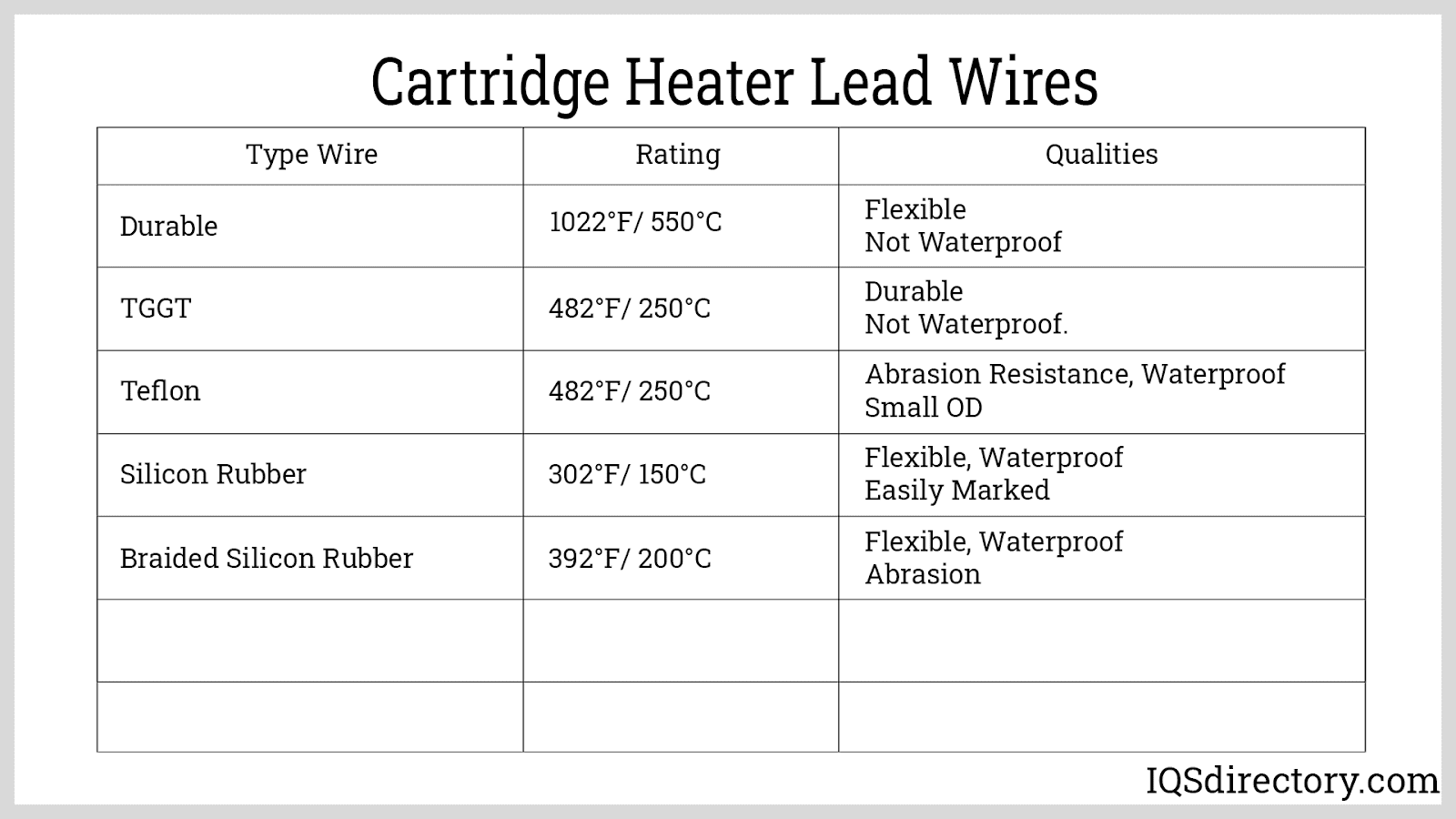 The types and specifications of lead wires vary based on the conditions in which the cartridge heater will be used. The lead wire provides the crucial electrical connection for the heater. Since it is vital for the heater's efficient operation, it is carefully chosen to suit the specific application and conditions. For high-temperature applications, fiberglass-insulated wire is commonly used. The chart below offers an overview of different cartridge lead wires, including their temperature ratings and characteristics.