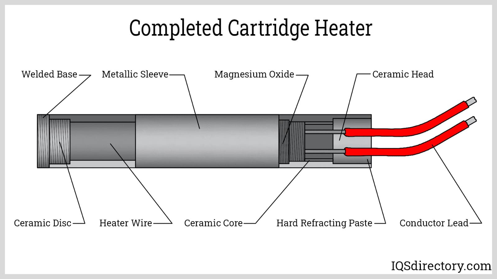 The diagram below illustrates the various components and parts of a completed cartridge heater.
