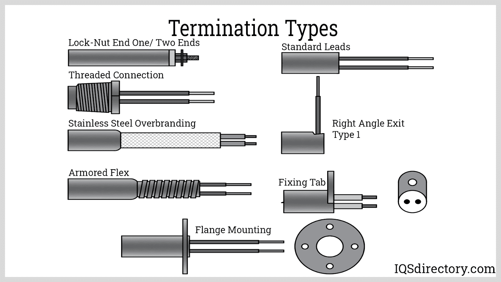 Termination types vary widely depending on the cartridge heater type and manufacturer. As shown in the diagram below, leads can exit the cartridge heater in several configurations, with straight leads being the standard method. In applications where leads might be exposed to harsh chemicals or extreme temperatures, they are often shielded with metal or silicone for added protection.