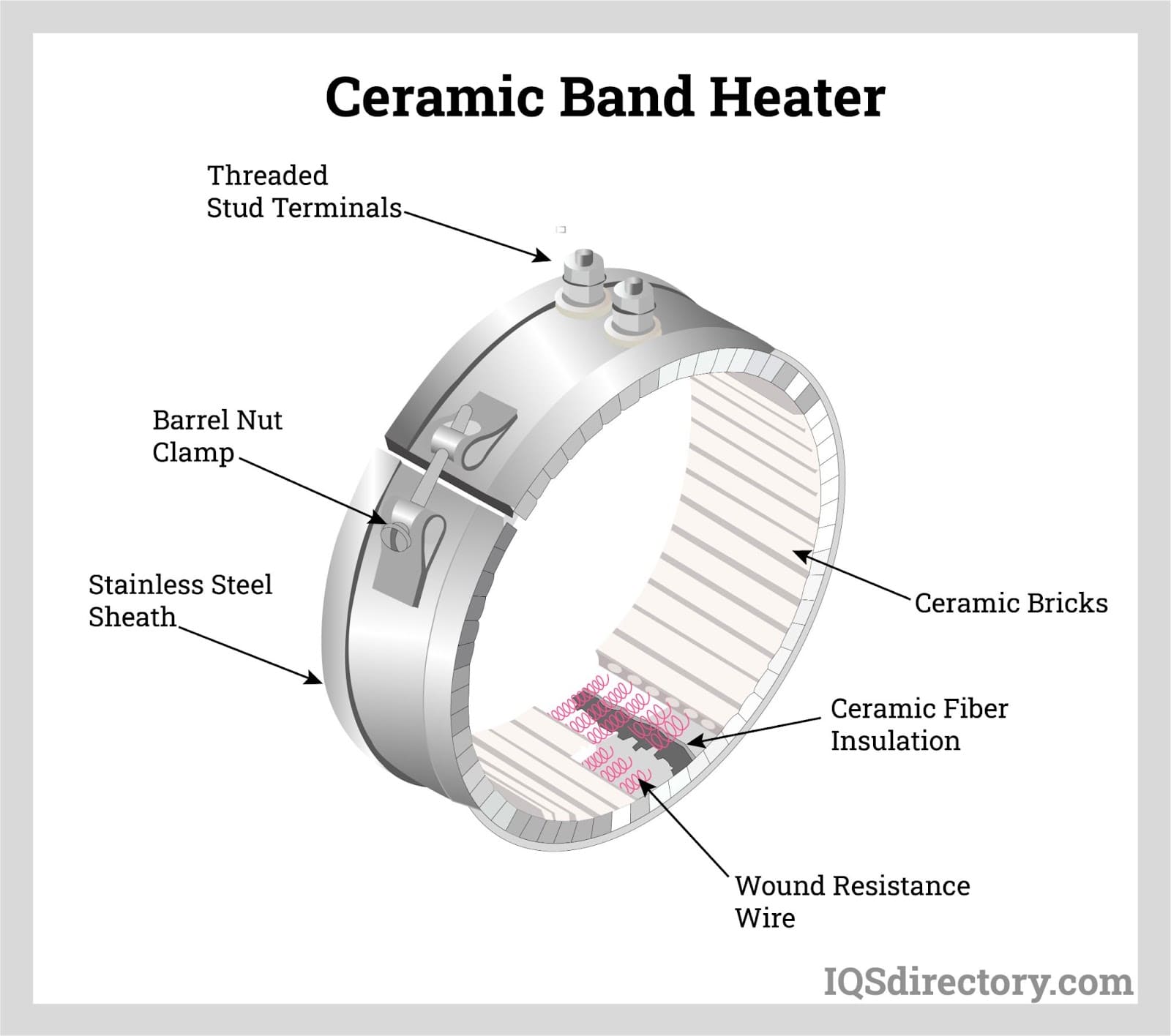Ceramic band heaters feature a resistance wire wound in a ceramic fiber, encased by ceramic bricks which sit snugly inside a circular metal sheath—commonly stainless steel or aluminum, with optional corrosion-resistant coatings. This layered design leverages ceramic insulation to minimize heat loss while maximizing energy efficiency, reducing wasted energy by 25–30%. Heat from the resistance wire is transferred by conduction and radiation.