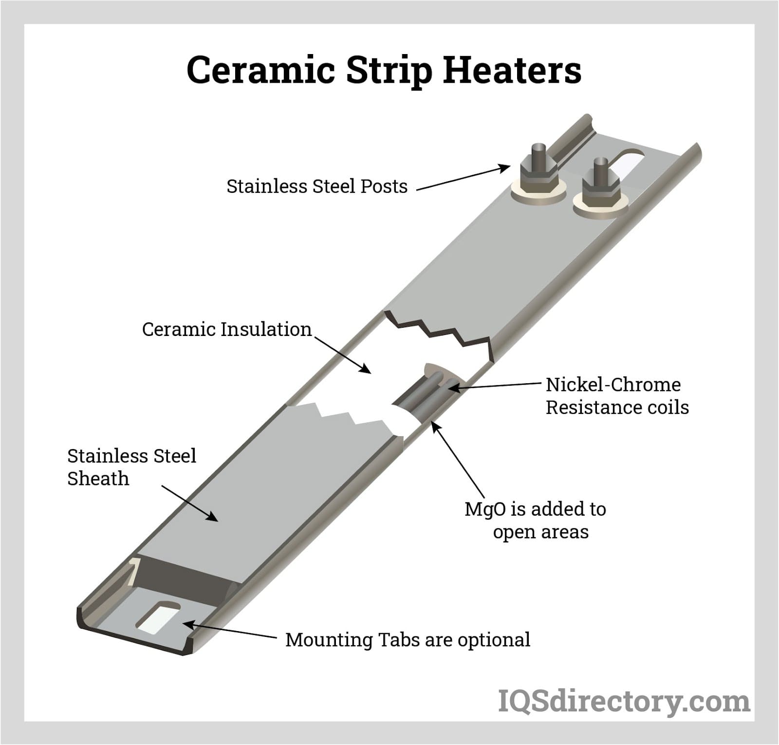 Ceramic strip heaters leverage a resistance wire coil embedded inside a ceramic core and insulated with magnesium oxide, all encased within a protective metal sheath. These flat, thin heating devices offer rapid thermal responsiveness, high temperature uniformity, and versatile form factors (various standard and custom shapes and widths). Their robust construction supports efficient surface heating for many process and industrial applications.