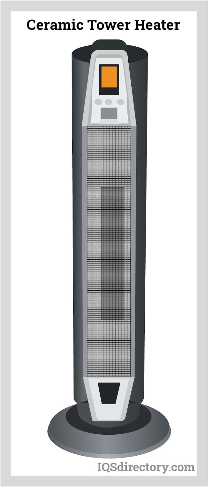 Ceramic Tower Heaters Owing to their tall, vertical build, ceramic tower heaters maximize airflow and surface area to distribute warm air widely and efficiently. Designed for energy savings in large spaces, such as living rooms or open-plan offices, they utilize oscillating fans and digital controls for even heat coverage and customized comfort.