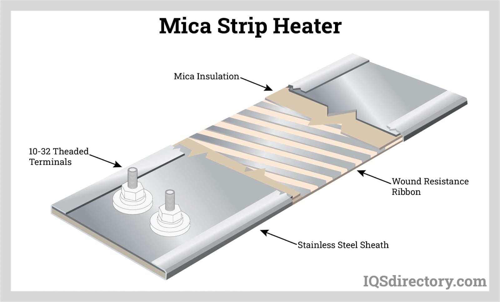 Mica strip heaters integrate resistance wire encased in a mica sheet and sealed inside a metallic sheath. Their primary strength is the delivery of heat to flat or slightly curved surfaces, where consistent temperatures and thin, low-profile design are required. Mica strip heaters are applied in pan drying, laminating presses, hot stamping, and packaging lines for their precise temperature control and fast heating response.