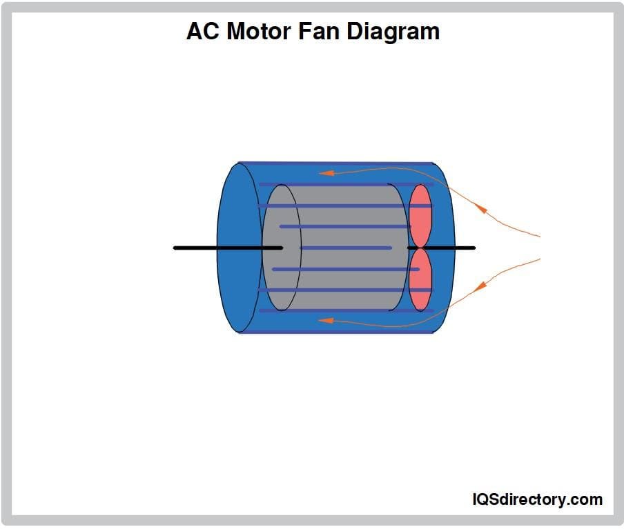 In AC motors, heat accumulates in the windings, necessitating an internal cooling system. Within the motor's enclosure, a fan is mounted on the rotor shaft at the opposite end from the axle that drives the connected machine. This fan draws in cool air and directs it across the windings, while hot air is expelled out the rear of the enclosure.