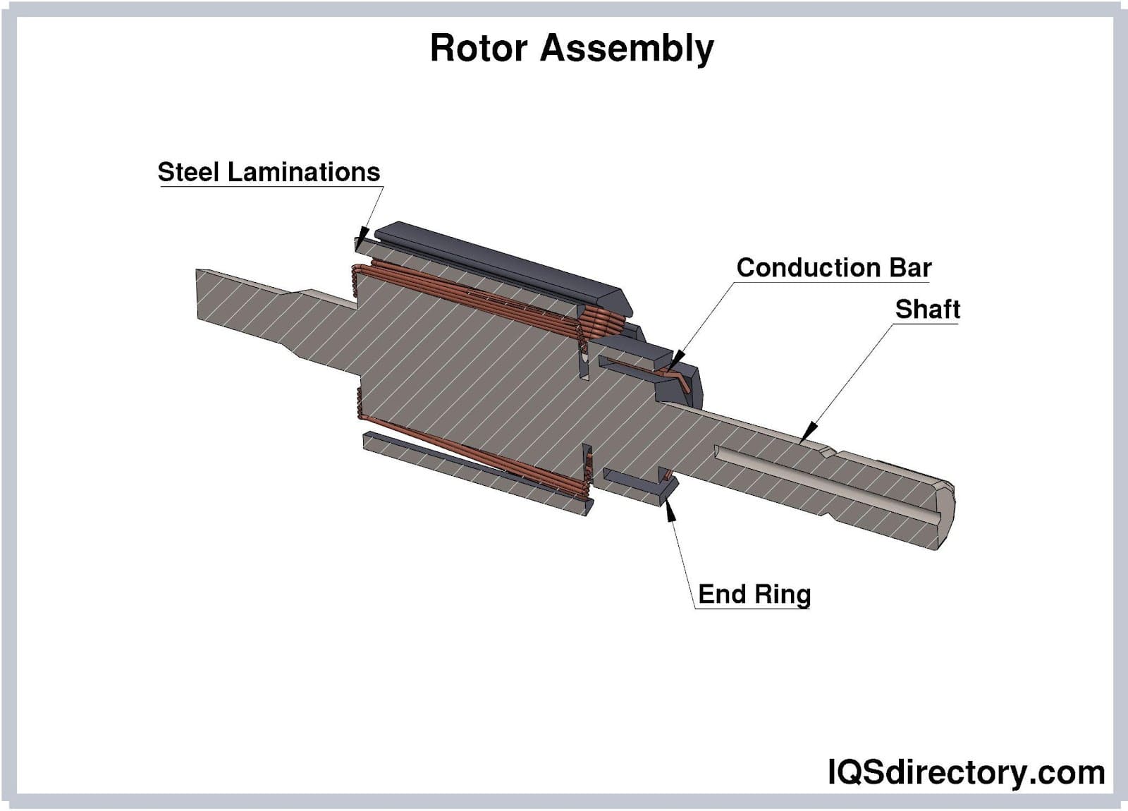 The rotor is the rotating part of an AC motor. The squirrel cage rotor is the most common type. Similar to the stator, it is constructed by stacking laminations to create a cylindrical shape. The squirrel cage is formed by inserting evenly spaced conductor bars into the rotor's slots. These bars are typically made of aluminum or copper.
