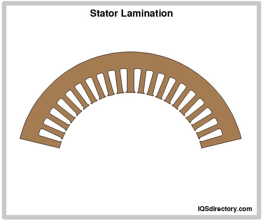 The stator is the stationary component of an AC motor and serves as the motor's electromagnetic circuit. It is constructed from laminations—thin metal sheets stacked to form a hollow cylinder. Using laminations helps minimize energy loss by reducing eddy currents.