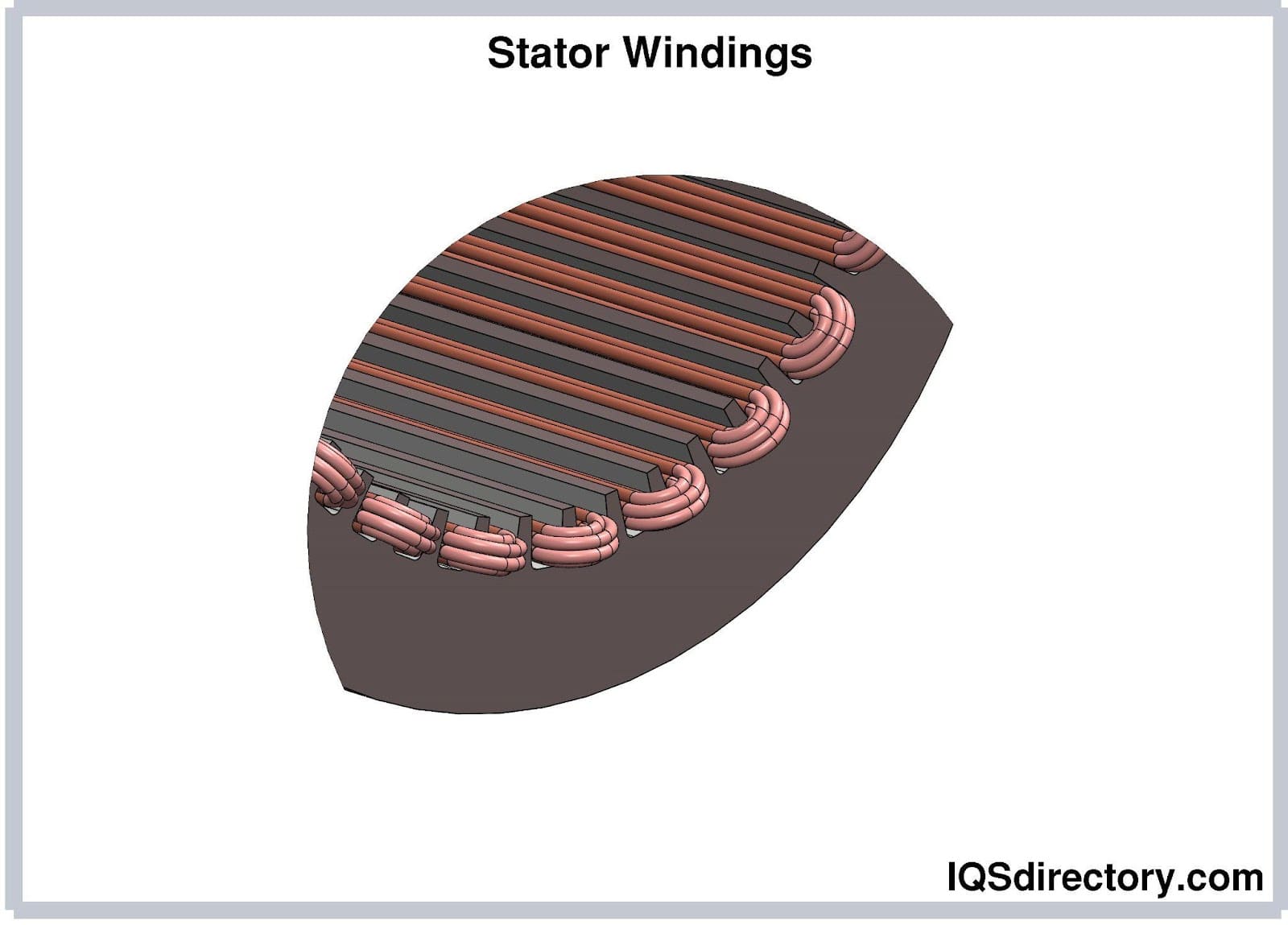 Stator windings consist of copper wire wound around the stator's slots. The number of slots is determined by the number of phases in the power supply. For example, a three-phase motor typically features six slots with three pairs of coil windings, each pair offset by 120 degrees. The term "winding" refers to the complete electromagnetic circuit formed by multiple identical coils. Generally, more coils result in smoother motor operation.