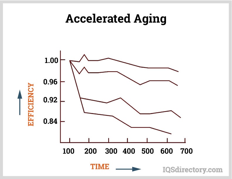Accelerated Age Testing uses a set of atmospheric conditions—including increased temperature, humidity, and occasionally light exposure—to substantially speed up the product aging process. This test is widely applied for new product validation to estimate service life and expected durability, particularly for polymers, coatings, and electronics. The full spectrum of stressors can be combined, such as temperature, humidity, vibration, and UV exposure, to yield a more comprehensive aging profile. The chart below illustrates the aging process of the luminous flux of a LED light.