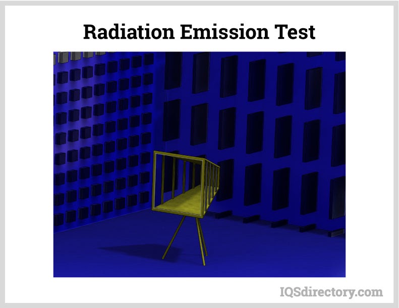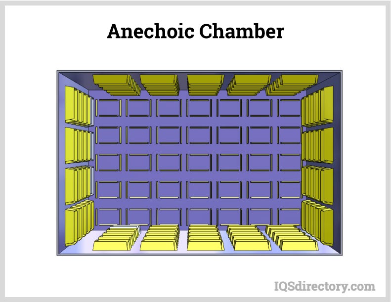 Anechoic or EMC test chambers are lined with sound and electromagnetic absorbing material to shield against attenuated electromagnetic interference. They test the radiated emissions of a product or its immunity to radiation emissions. Since the chambers are shielded against outside interference, an operator receives an accurate measure of the EMC field generated by a device and can determine if a piece of equipment complies with emission standards. The image below is of the interior of an anechoic chamber.