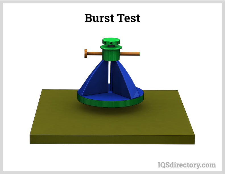 The burst test, depicted above, determines the highest pressure this cardboard specimen can endure before failing. This test is one of the endurance assessments performed in test chambers.
