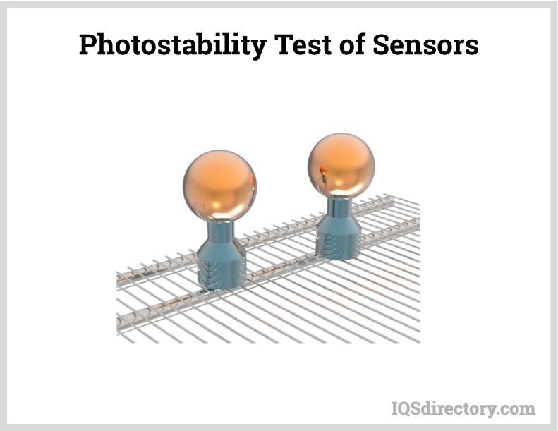 Below is an image illustrating a photostability test performed on spherical sensors, simulating UVA and visible light (VIS) conditions to analyze potential photo-induced effects. Photostability chambers also support material researchers and quality managers in evaluating optical sensors, plastics, and coatings for color stability, metamerism, and overall product performance.