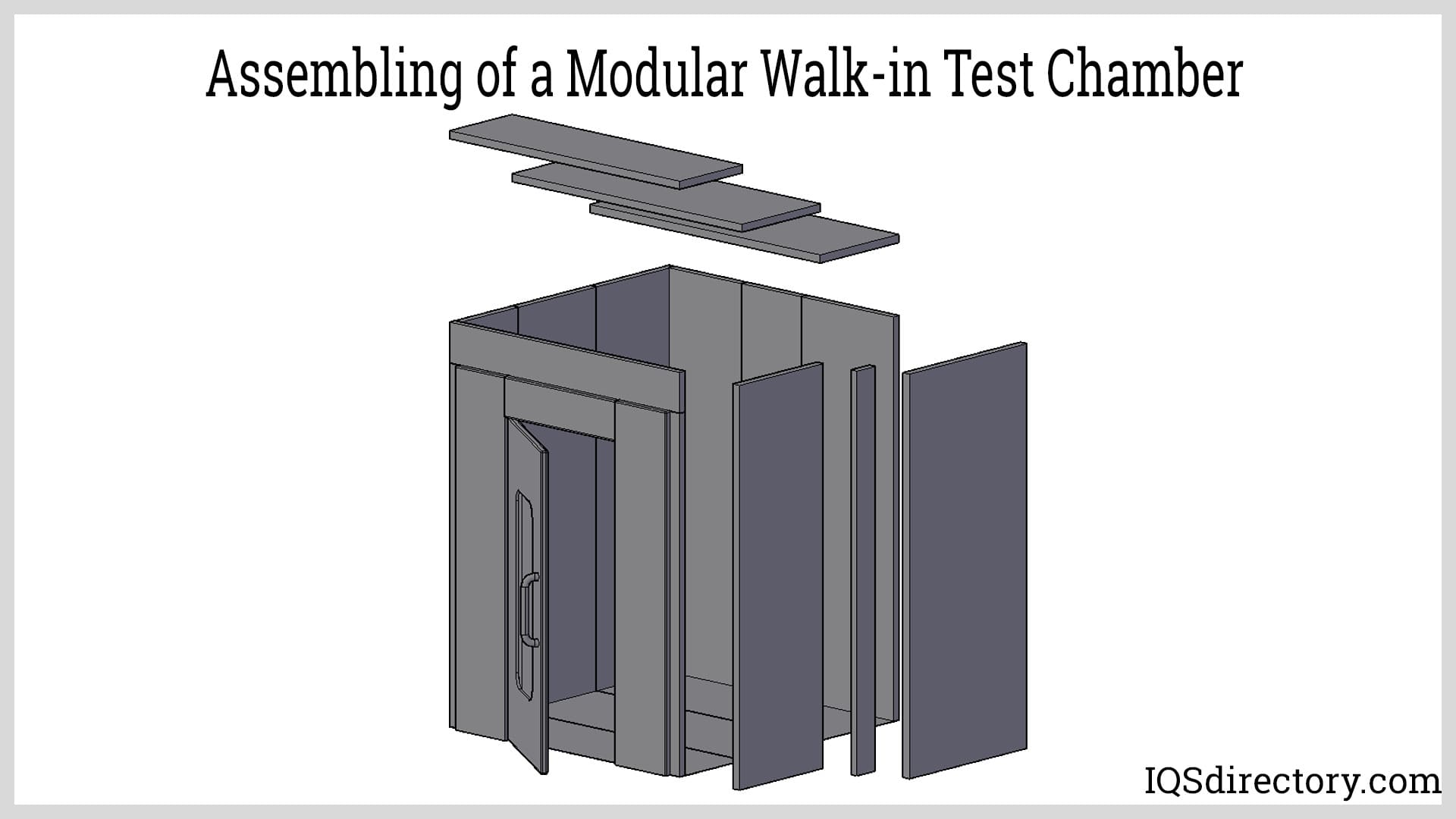 As with all forms of walk-in test chambers, modular walk-in test chambers can be very small with room for one or two persons up to very large. They are often used when there is restricted access to assembly areas or cost is a consideration. The structure of the modular panels for a modular walk-in test chamber includes sectional panels that have a metal inner layer and outer skin bonded to a core of insulation with cam action locks to connect each panel. The size of the panels vary in accordance with the size of a walk-in test chamber.