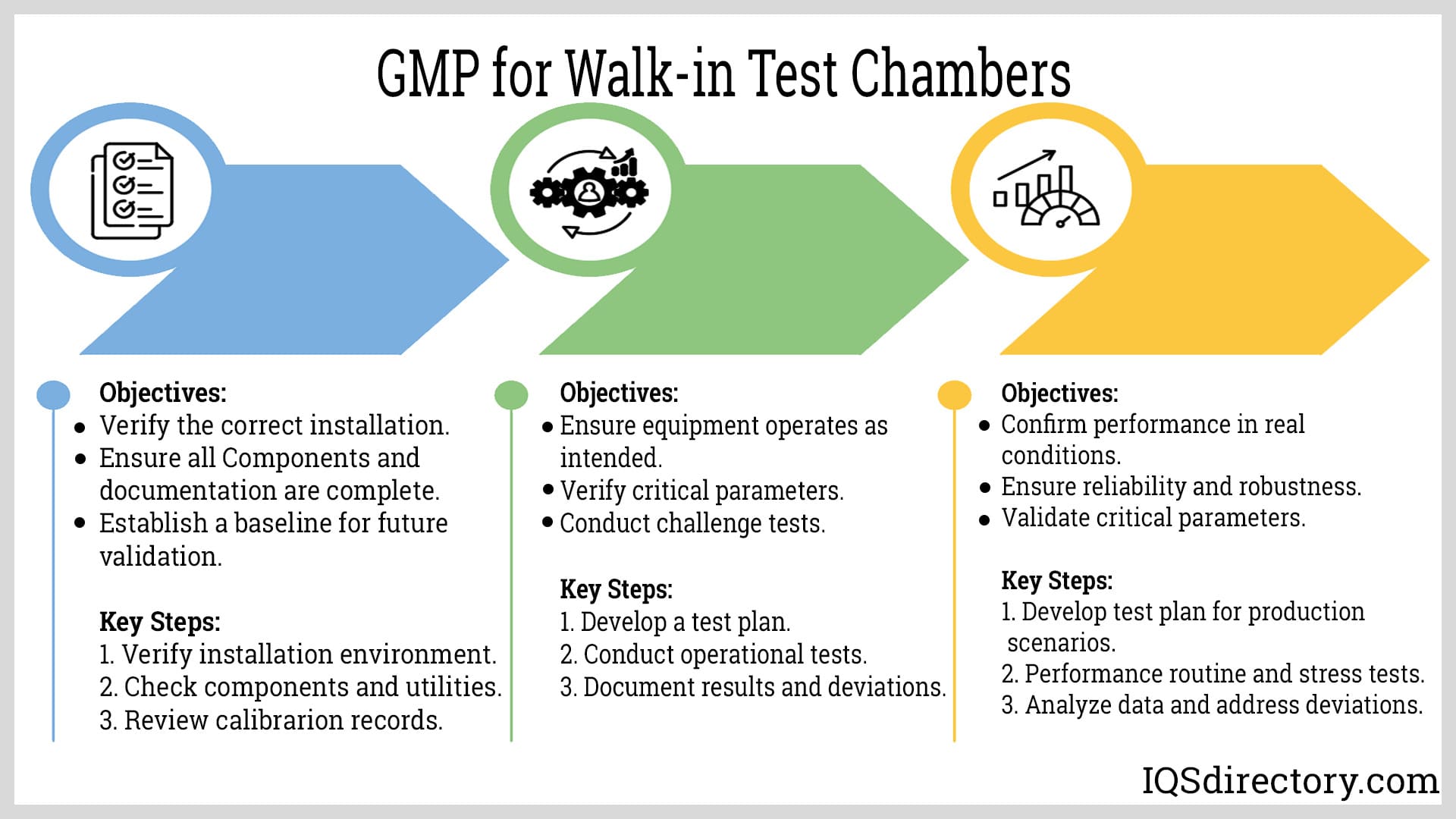 Before a walk-in test chamber can be used or certified, manufacturers must prove adherence to the stipulations in the above regulations in regard to the products being tested. The validation process includes installation qualification (IQ), operational qualification (OQ), and performance qualification (PQ).