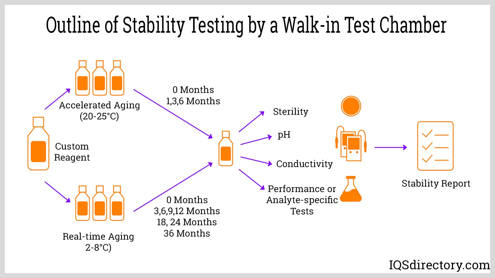 The size of walk-in test chambers enables researchers to perform several different types of tests, including stability, aging, accelerated shelf life, and for the cultivation of various types of bacteria. As with all forms of testing, walk-in test chambers enable researchers to control environments by changing temperatures, levels of humidity, vibrations, and other factors that interfere with a product's life cycle. The primary function of walk-in test chambers is to assess and examine the stability, reliability, and durability of products by producing conditions products will encounter during their use.