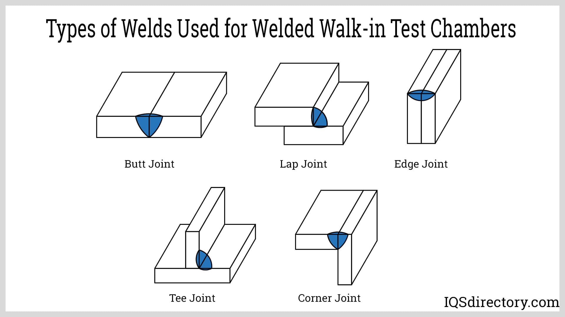 Welded permanent walk-in test chambers have a solid construction with interior steel walls and exterior steel or metal walls with foam insulation between the interior and exterior walls. The interior walls, floor, and ceiling are welded to form a completely sealed compartment. Windows may be added for observation purposes that are sealed with durable, long-lasting material. The configuration of welded walk-in test chambers enables them to quickly change temperatures, endure the pressure of high humidity, and provide resistance to explosions.