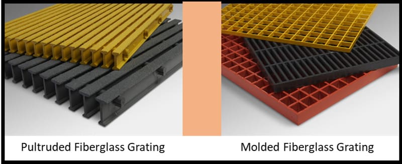 Fiberglass grating is available in two main types: molded and pultruded. Molded fiberglass grating is produced using molds and comes in diverse thicknesses, patterns, and dimensions. It can be cut into square mesh patterns for flooring or used in rectangular shapes for applications like trench covers and walkways. Both configurations can feature skid-resistant surfaces.