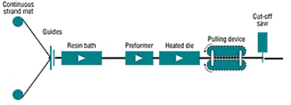 The process for the formation of panels and sheets of fiberglass is called pultrusion, which is different from extrusion. With pultrusion, a pulling system pulls the combined materials through the pultrusion machine.
