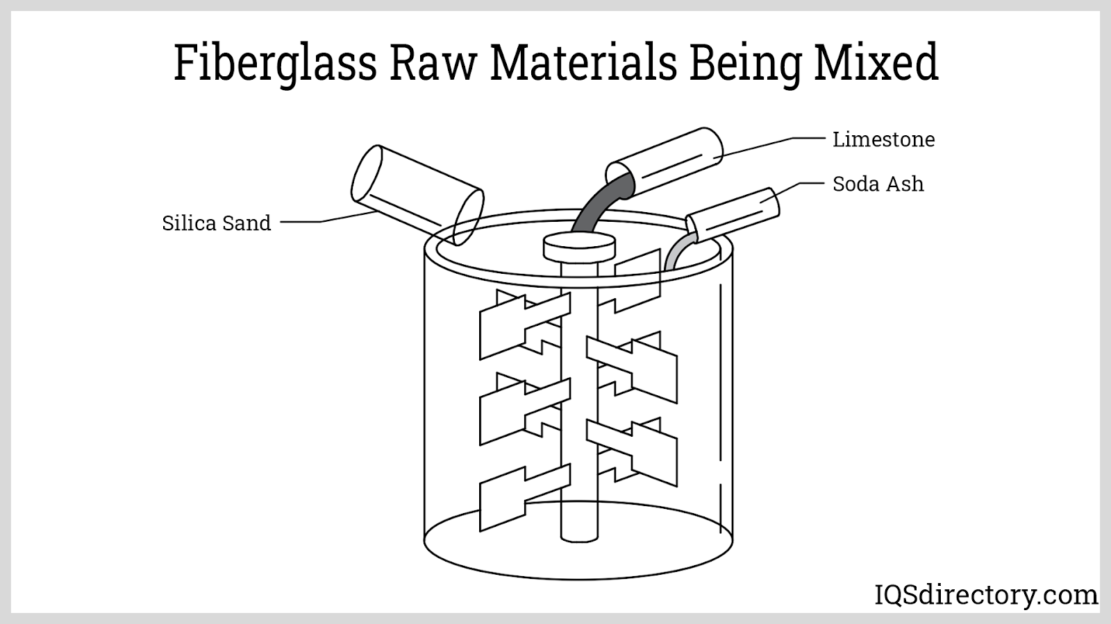 • The ingredients for fiberglass include silica sand, limestone, and soda ash. Added to those basic ingredients are calcined alumina, borax, feldspar, nepheline syenite, magnesite, and kaolin clay to name a few.