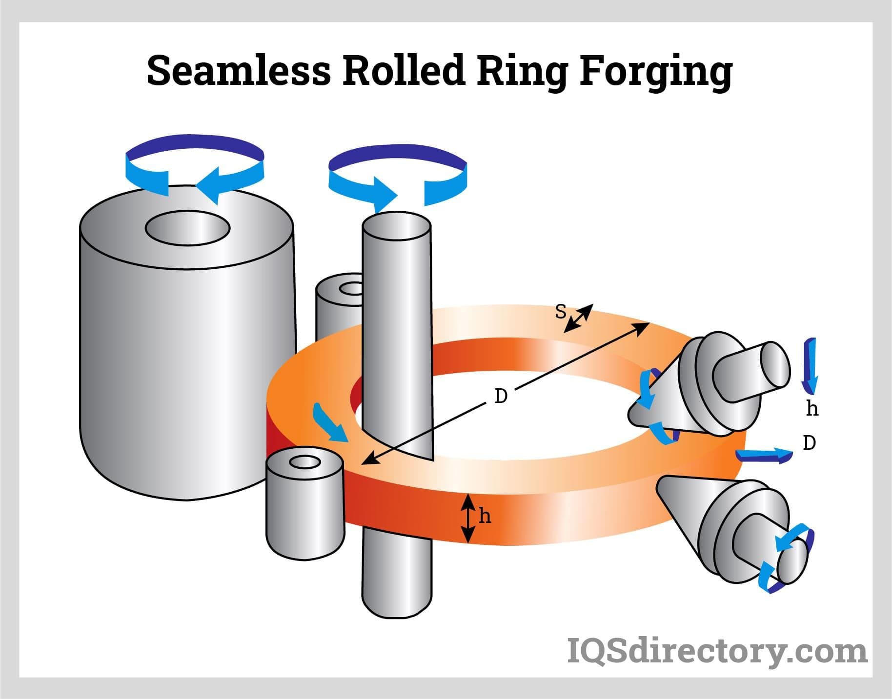 Rolled ring forging is a metal working process that involves punching a hole in a thick, solid, round metal piece to create a donut shape and then squeezing and pressuring the donut shape into a thin ring...