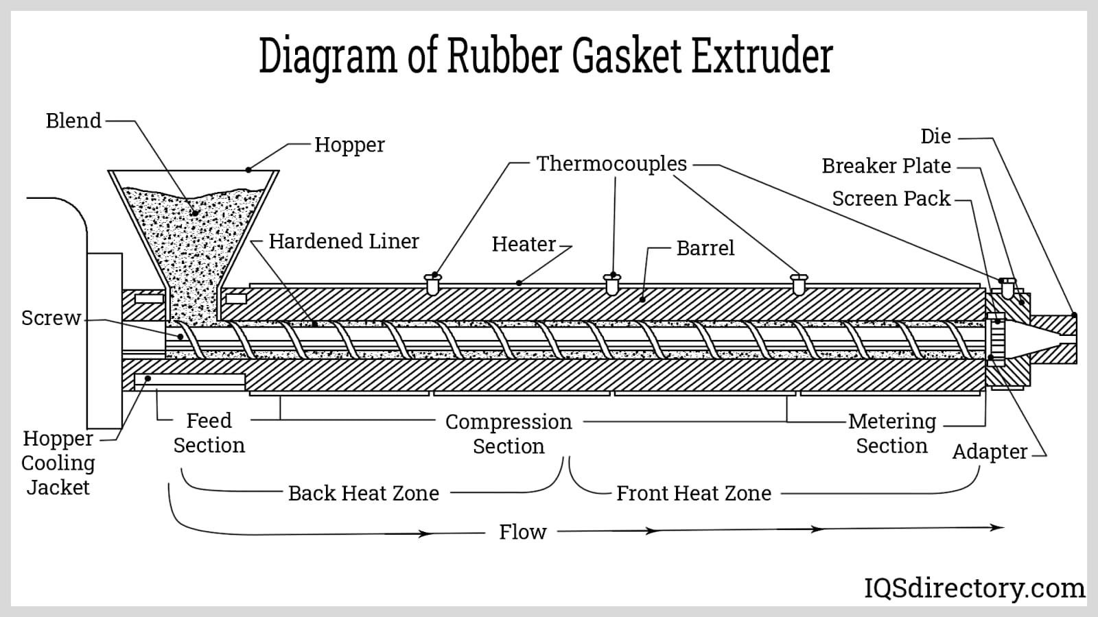 During extrusion, a helical screw inside the barrel moves the rubber compound forward, while heating elements warm the material to make it more flexible. The rubber is subjected to increasing pressure and temperature as it progresses towards the die. Once the rubber exits the die, it may expand or swell depending on the hardness of the material and the formulation used.