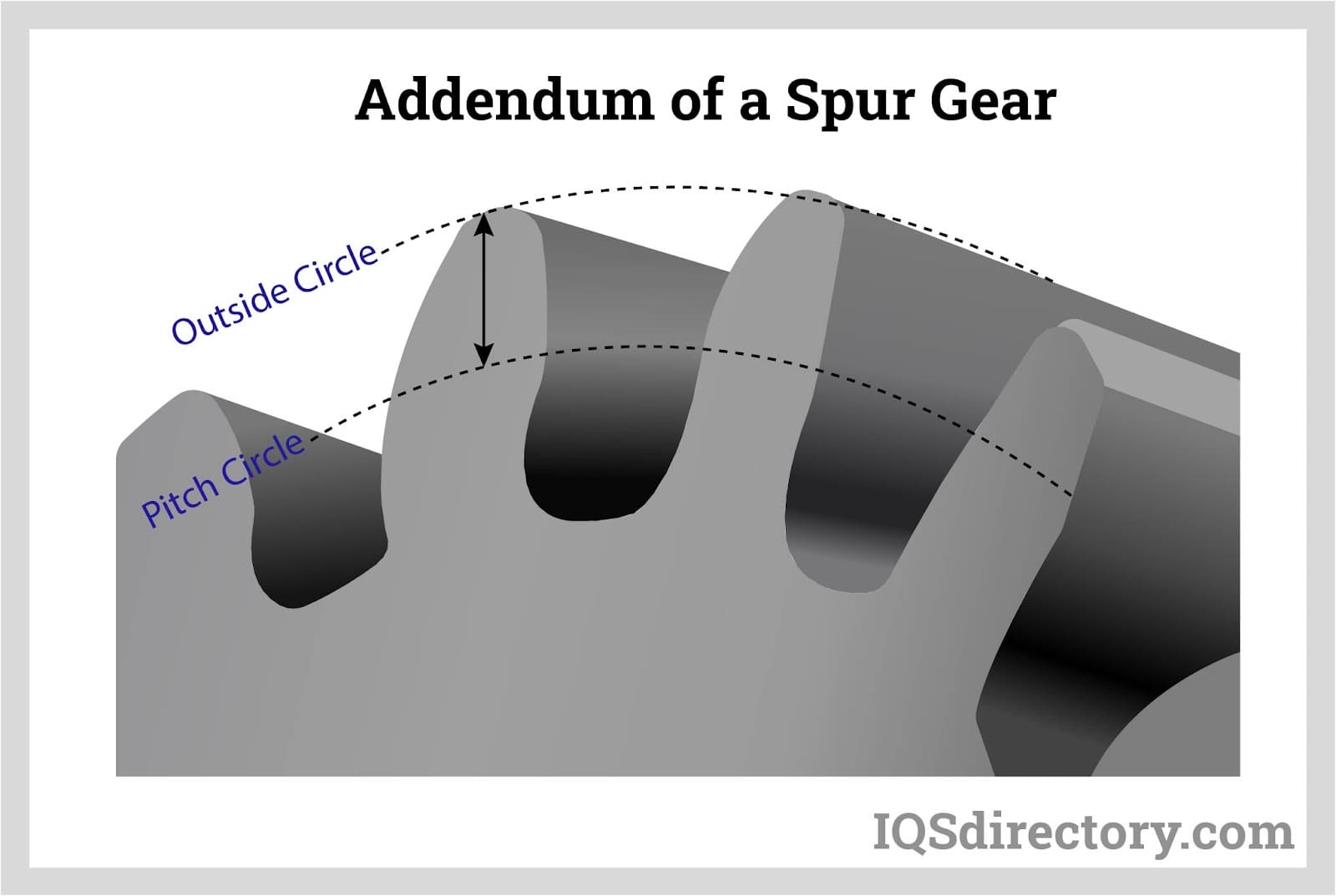 The addendum in a spur gear denotes the radial distance from the pitch circle to the crest of a gear tooth (top land). Proper addendum sizing impacts tooth strength and prevents undercutting or premature wear during power transmission.