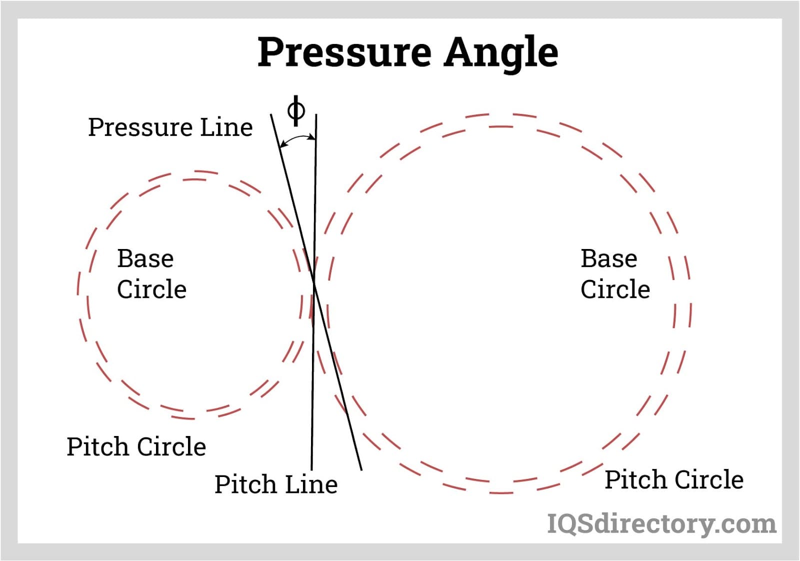 The pressure angle is a vital design parameter in involute spur gears, defined as the angle between the line of action and a tangent to the pitch point. Common pressure angles are 20° and 14.5°, both affecting tooth profile, noise generation, and load transfer efficiency. A higher pressure angle results in stronger, more robust teeth but may increase friction and noise.