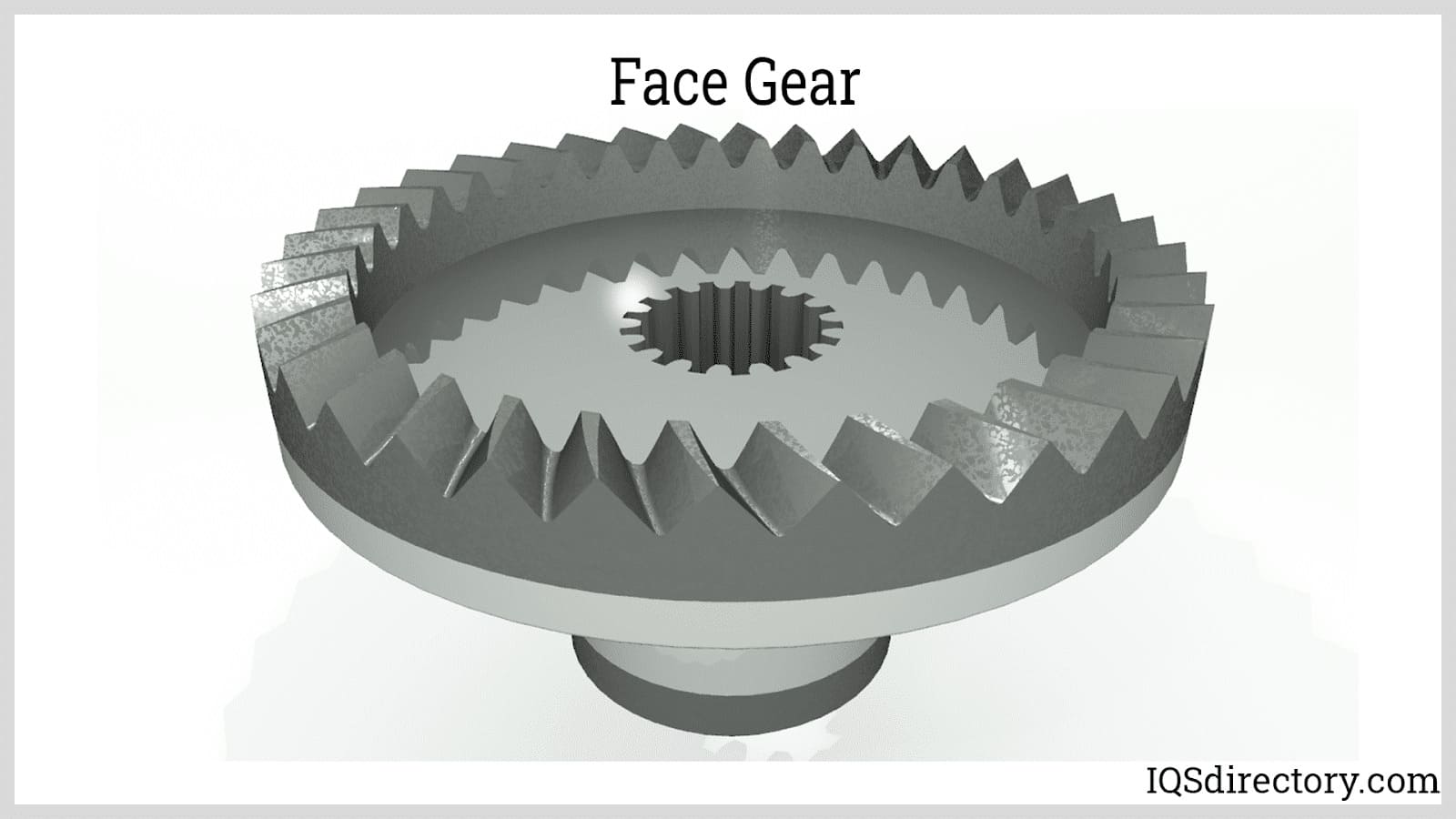 Face gears, also called crown gears or contrate gears, have teeth machined on a flat circular face, perpendicular to the axis of rotation. Typically, a face gear meshes with a spur or bevel pinion, transmitting motion at right angles. Face gears are used in precision applications, instrument drivetrains, and some aerospace gearboxes, and are valued for their efficiency and ability to handle high shock loads.