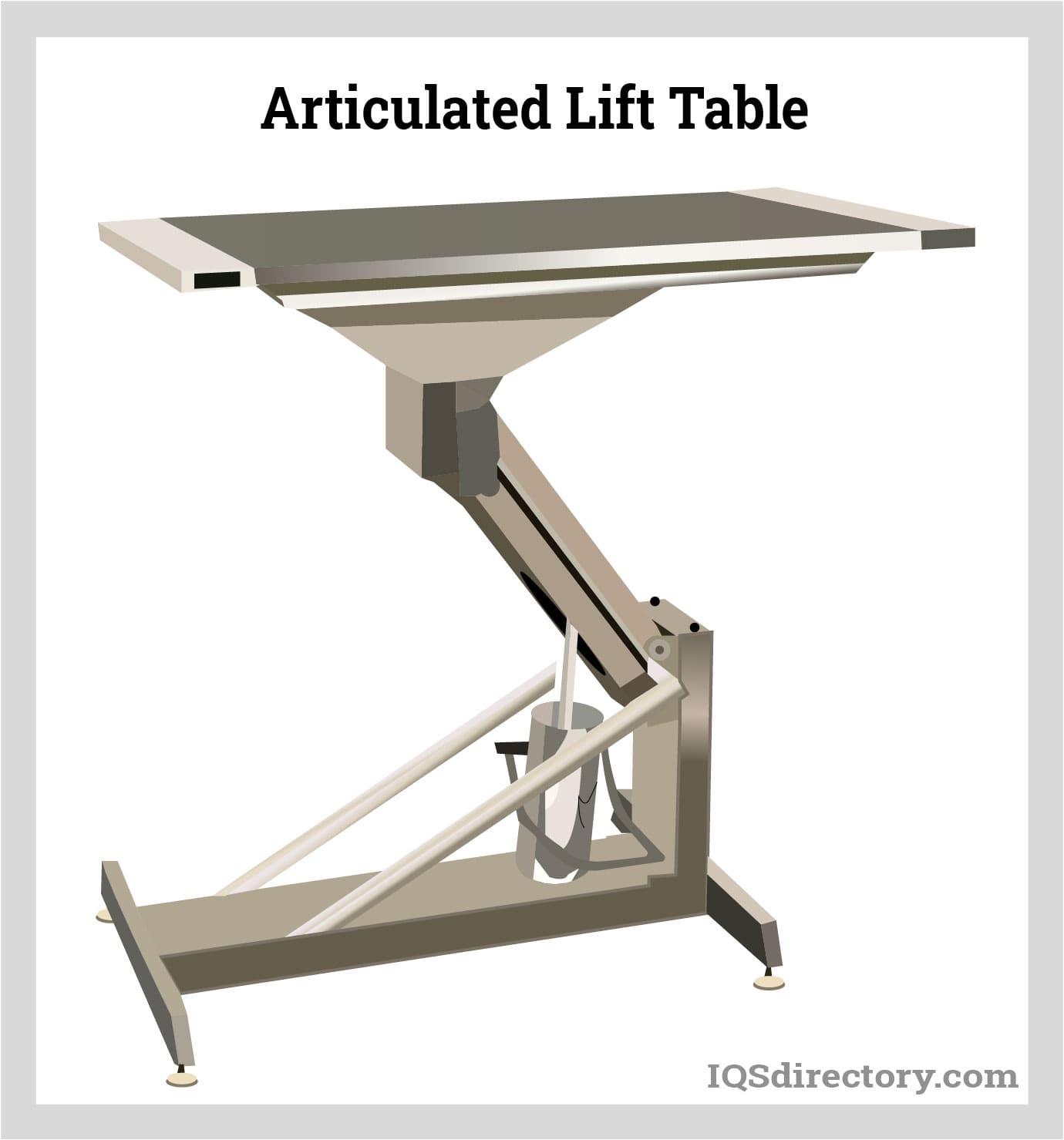 An articulated lift table features a multi-link (often two-part) lifting mechanism, typically powered by one or more electric motors. As one support segment elevates, the upper linked segment rises in tandem, smoothly carrying the work surface to the required height. This unique lifting geometry allows for versatile movement, including both vertical and horizontal adjustments in some models. Articulated lift tables are reflective of cherry picker or aerial work platform designs, making them suitable for technical work, light assembly, and environments where access to varying heights and ergonomic positions is required.