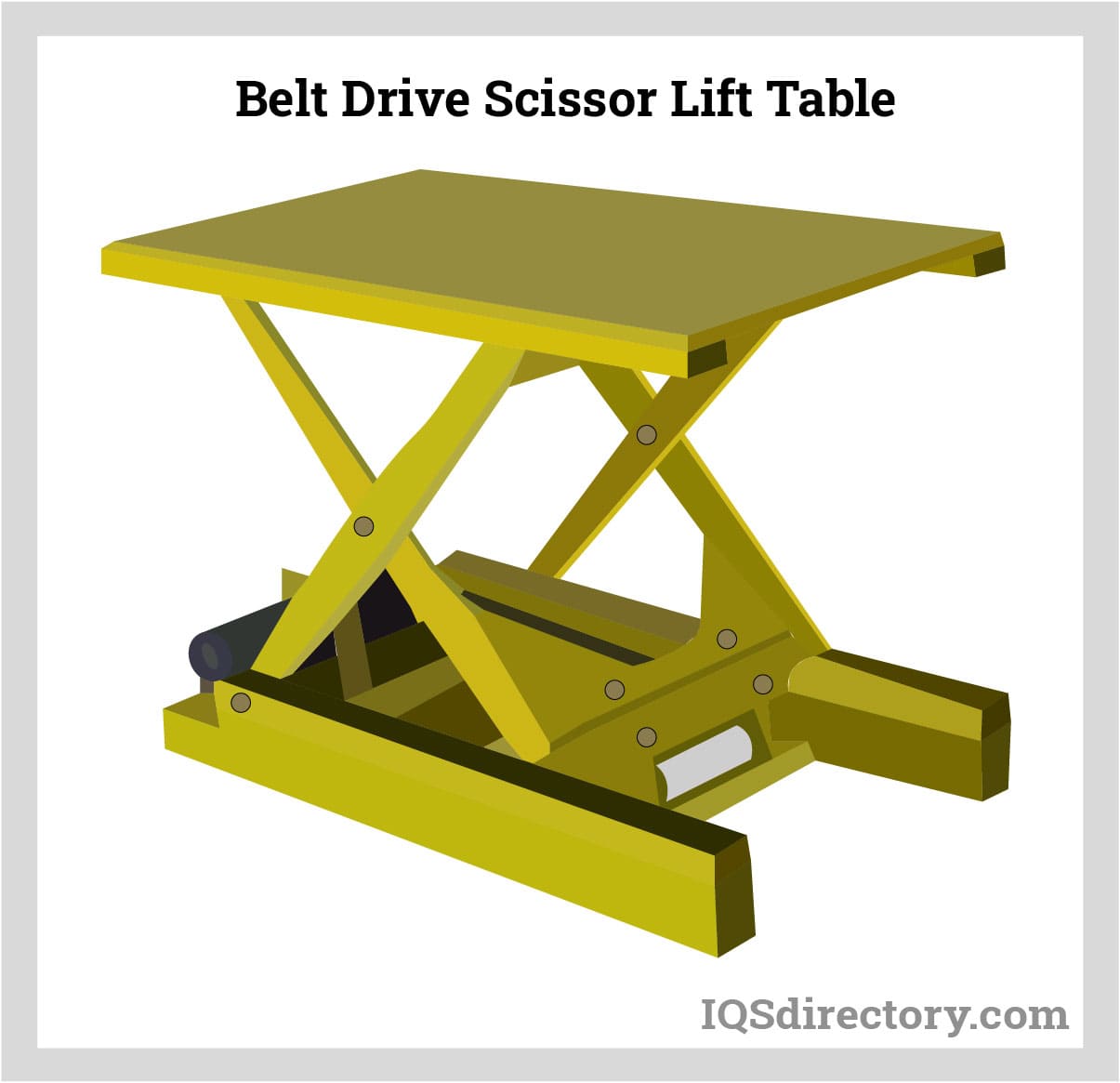 Scissor lift tables use folding arms for vertical motion and can be powered by hydraulic, pneumatic, or electric systems. Belt and screw drive tables use mechanical or belt-driven systems, with screw drives offering incremental precise adjustments and belt drives providing maintenance-friendly, quiet operation.