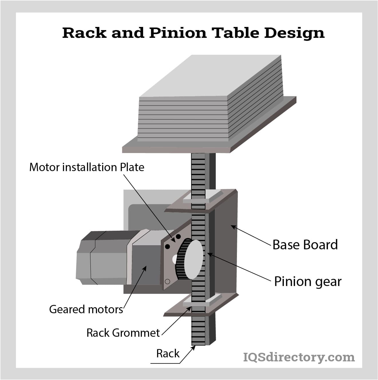 Rack and pinion lift tables utilize a rigid support column and a pinion gear mechanism, powered by a geared electric motor, to adjust the platform's height. This industrial lifting method allows for exceptional structural integrity and can accommodate extremely heavy or oversized loads. The rack acts as a linear gear that guides vertical movement, while the motor-driven pinion gear translates rotational force into vertical lifting motion—comparable to automotive jacks or industrial hoists.