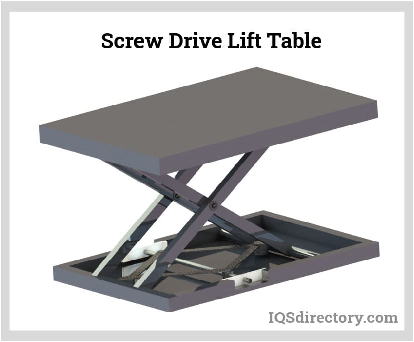 Screw scissor lift tables incorporate a mechanical screw drive within the scissors support structure. A threaded screw, driven by a motor or operated by hand crank, extends or retracts to raise or lower the table. This precision motion allows for smooth, incremental height adjustment without the use of hydraulic fluid or compressed air. Screw-driven lift tables are valued for their self-locking ability, which keeps the platform stable in any position and minimizes the risk of accidental descent.