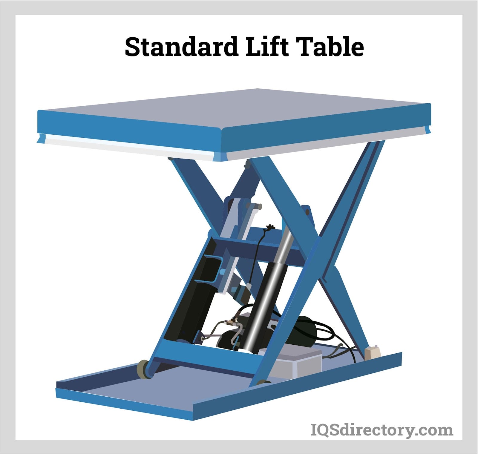 With a minimum lowering height of approximately eight inches, standard lift tables can be efficiently loaded or unloaded with common warehouse equipment such as forklifts and pallet jacks. Most models use electric or hydraulic motors for smooth, stable lifting motion, and feature robust scissor mechanisms for safety and durability. Standard lift tables improve production throughput and help organizations comply with occupational health and safety protocols.