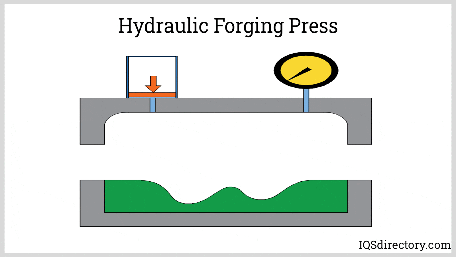 The forging press process uses a vertical ram to apply gradual, controlled pressure to a die holding a workpiece.
