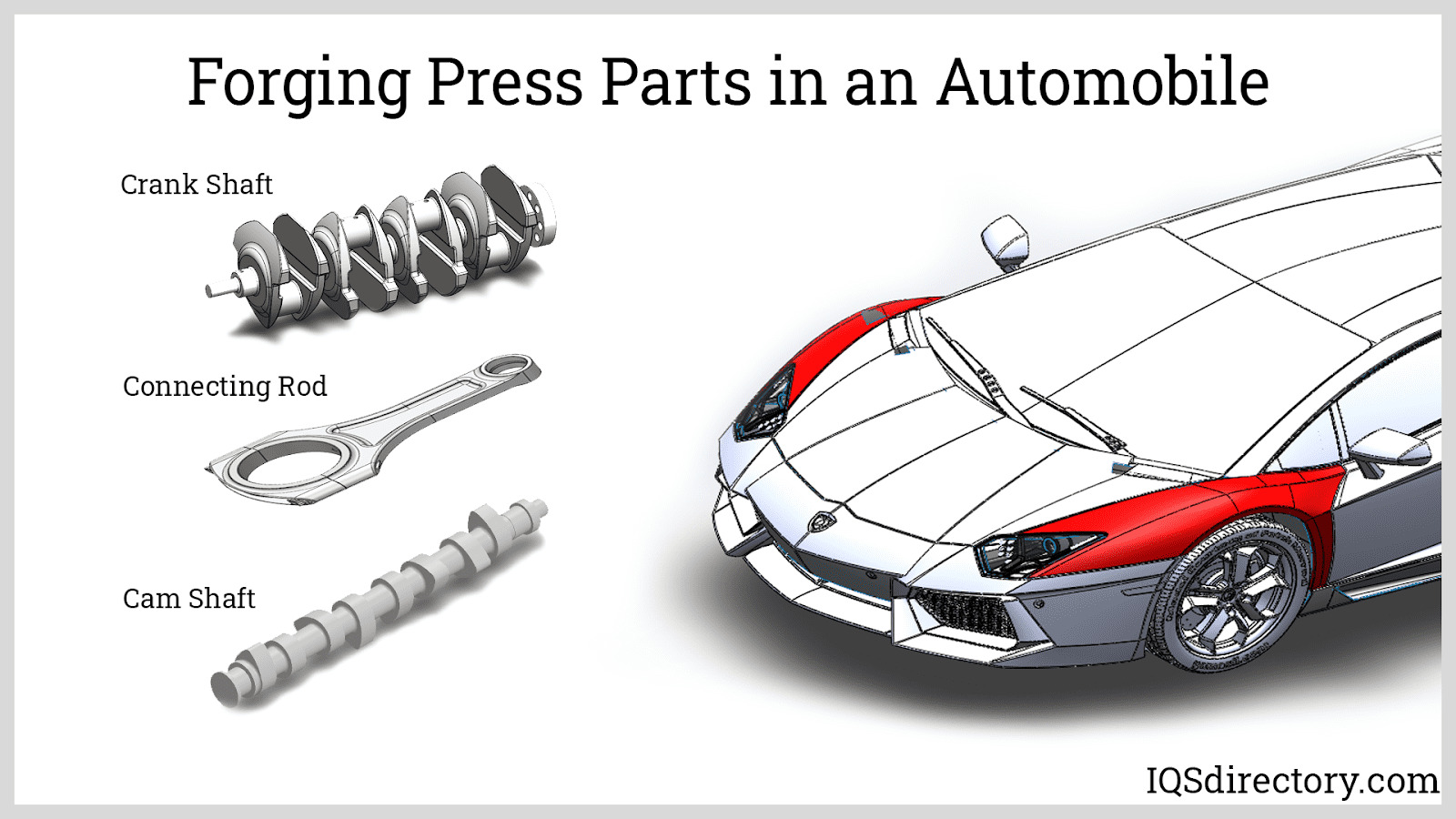 In automobiles, press forged components are used at locations subjected to shock and stress. A single car or truck may contain more than 200 press forged parts. Some examples are illustrated in the diagram below.