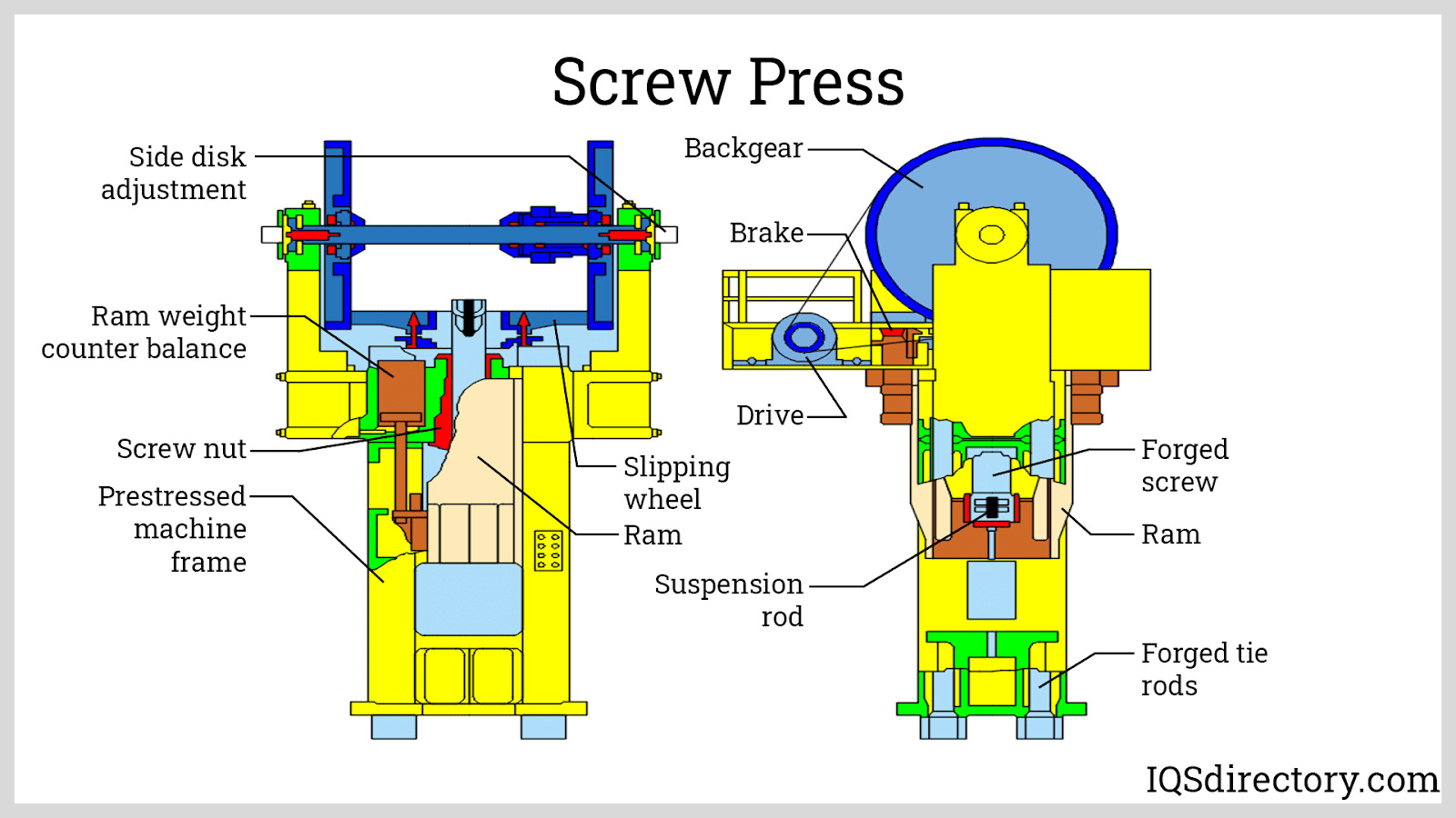 Friction Drive Forging Presses - Utilize vertically mounted continuous drive wheels. The downstroke is achieved by engaging the drive wheels and flywheel, accelerating the ram. Once energy is expended, the system stops; reversing brings the ram to the top. They are robust, easy to maintain, and commonly used for medium to large forgings.