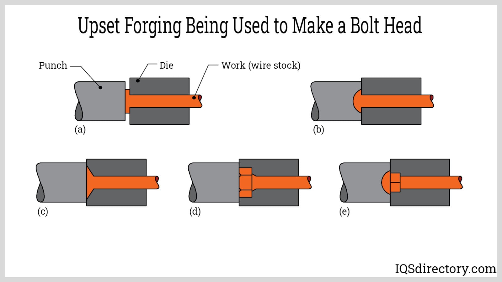 Upset forging is frequently employed as an intermediate stage in closed-die or progressive forging sequences. Its primary applications include the production of fasteners (bolts, screws, nuts, and rivets), flanged shafts, axles, pipeline fittings, and specialty automotive, aerospace, and construction parts.