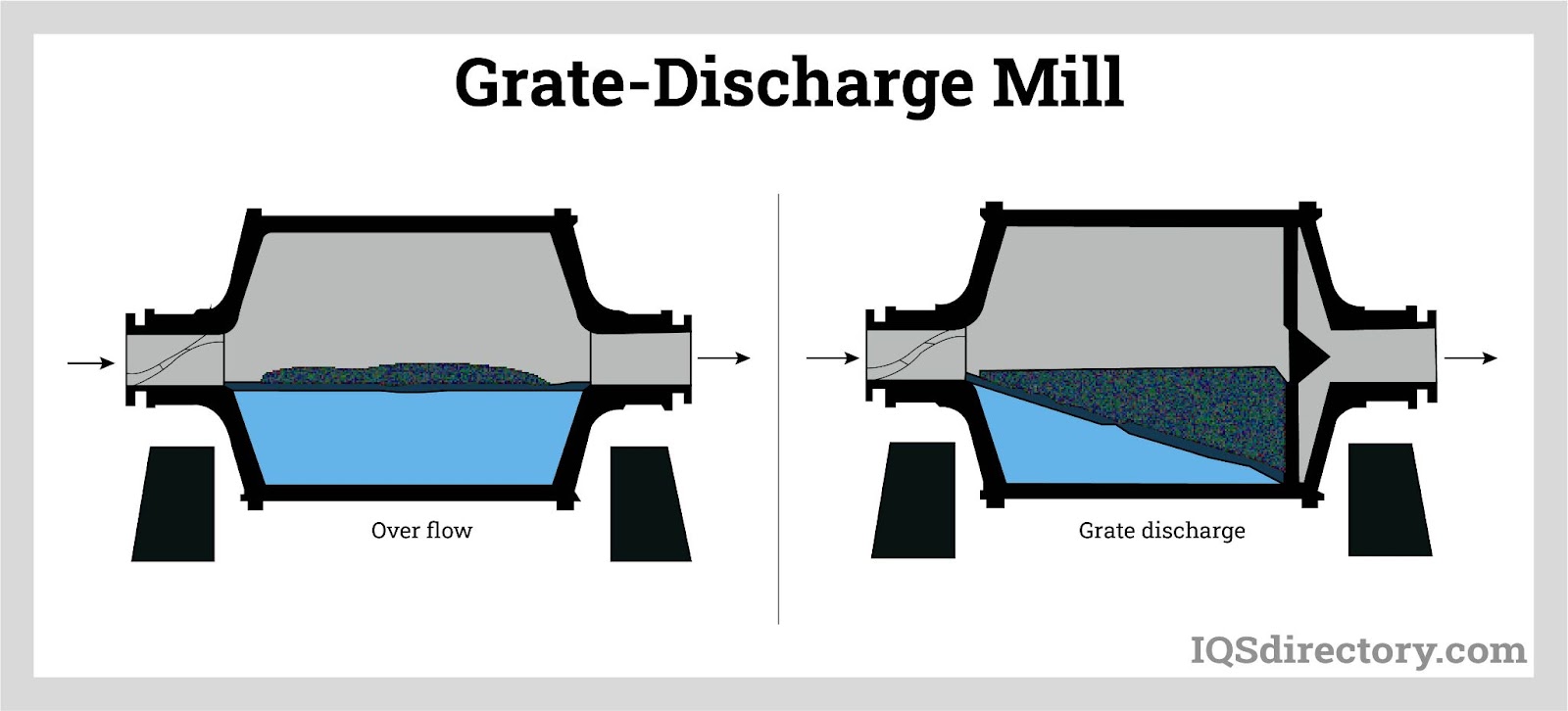 In a grate-discharge mill, the diaphragm is designed as a grate, which controls the discharge of the grinding balls to the end of the mill. This grating system ensures that the ground material is retained in the space between the diaphragm and the opposite end of the mill, where it is collected by a scoop.