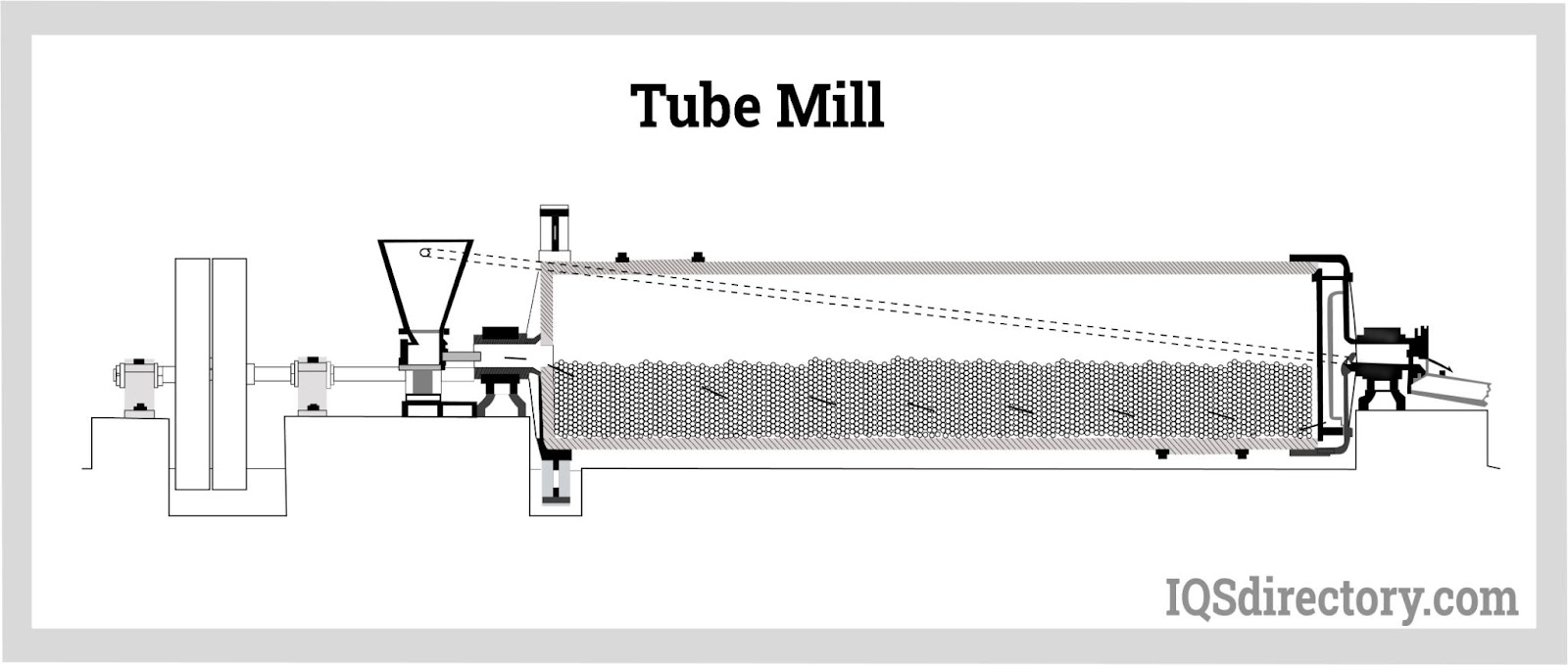 A tube mill features spherical grinding media, but its length is significantly greater than its diameter. It consists of rotating cylinders with smooth interiors filled with hard, round balls. The interior lining of these mills is typically constructed from durable materials such as hardwood or iron alloys, including steel and manganese steel.