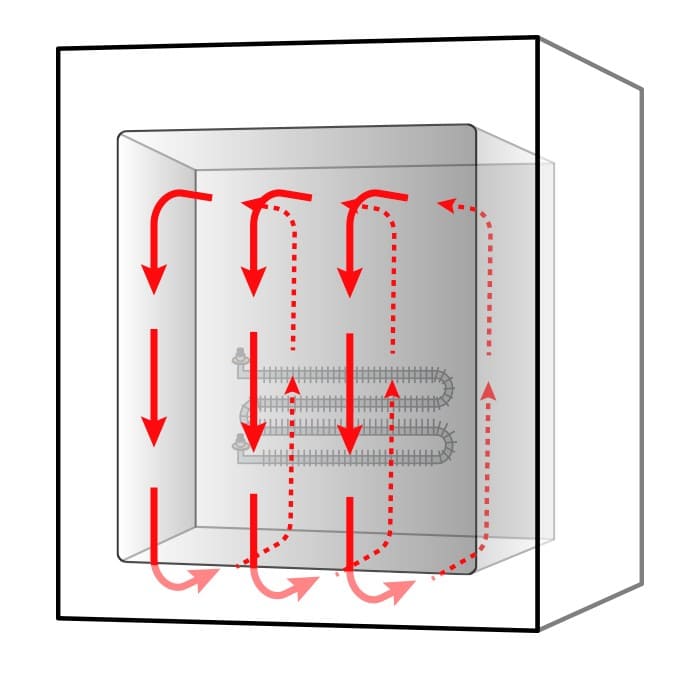 Horizontal – for products loaded on shelves or hung. This airflow works well for consistent heat treatment in batch ovens and cabinet ovens.