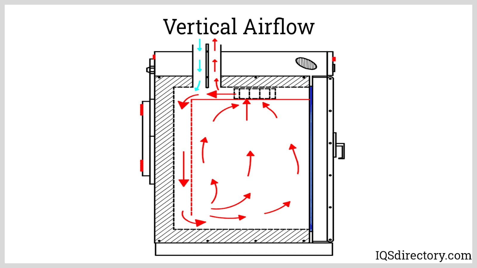 Horizontal/Vertical – Air is returned through ceiling ducts. This pattern is often used to improve temperature uniformity for processes like powder coating or thermal processing.